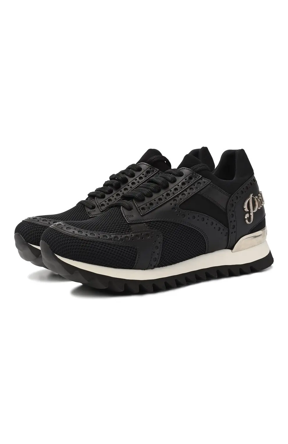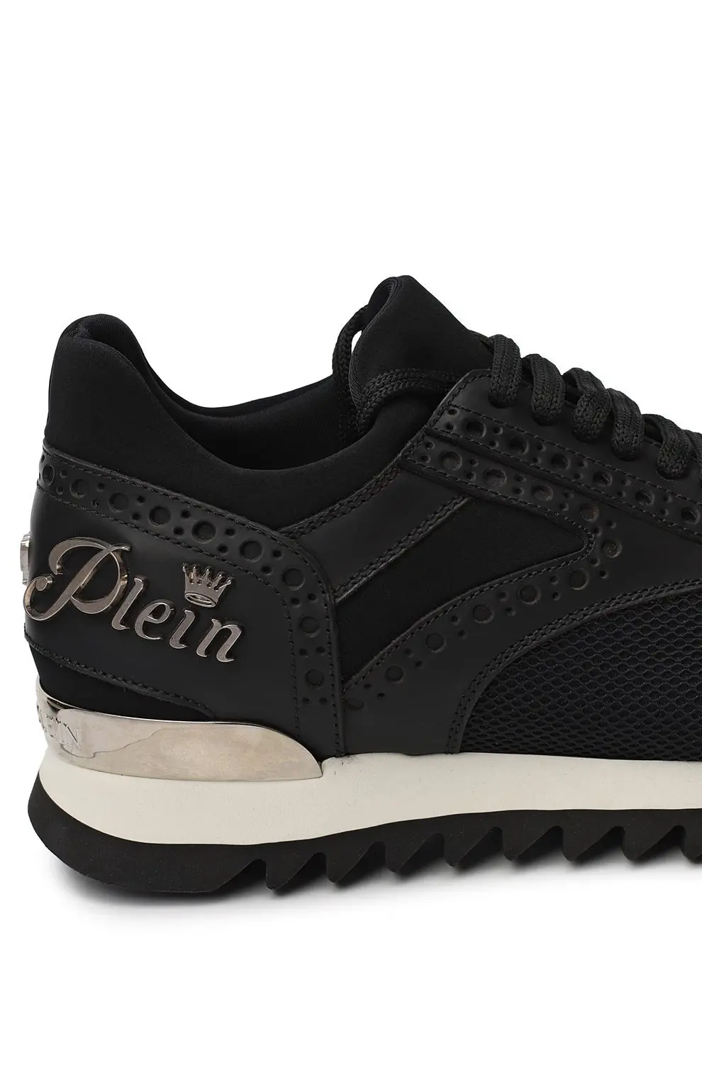 Кроссовки Lagos от Philipp Plein — это смелое сочетание спортивной динамики и фирменной дерзости бренда. Верх выполнен из комбинации сетчатого текстиля и гладкой кожи с декоративной перфорацией в стиле брогов, что придаёт модели характерный акцент. Контрастная белая подошва с зубчатым протектором обеспечивает комфорт и надежное сцепление при ходьбе, а металлический логотип сзади добавляет яркий штрих роскоши.