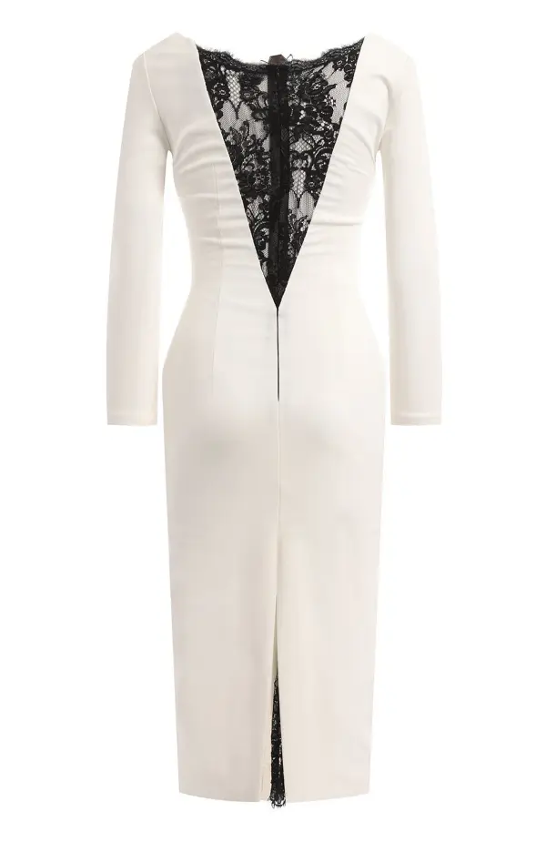 Платье от Philipp Plein, выполненное из мягкой вискозы, привлекает внимание смелым и изысканным дизайном. Белоснежная основа подчеркнута контрастными вставками из чёрного кружева на груди и разрезе юбки, создающими эффектный акцент и добавляющими чувственности образу. Облегающий силуэт с длинными рукавами элегантно подчеркивает фигуру, а декоративная пряжка у выреза придаёт модели характерный для бренда дерзкий штрих. Это платье идеально подойдёт для вечерних мероприятий, где требуется сочетание роскоши и провокационного стиля.
