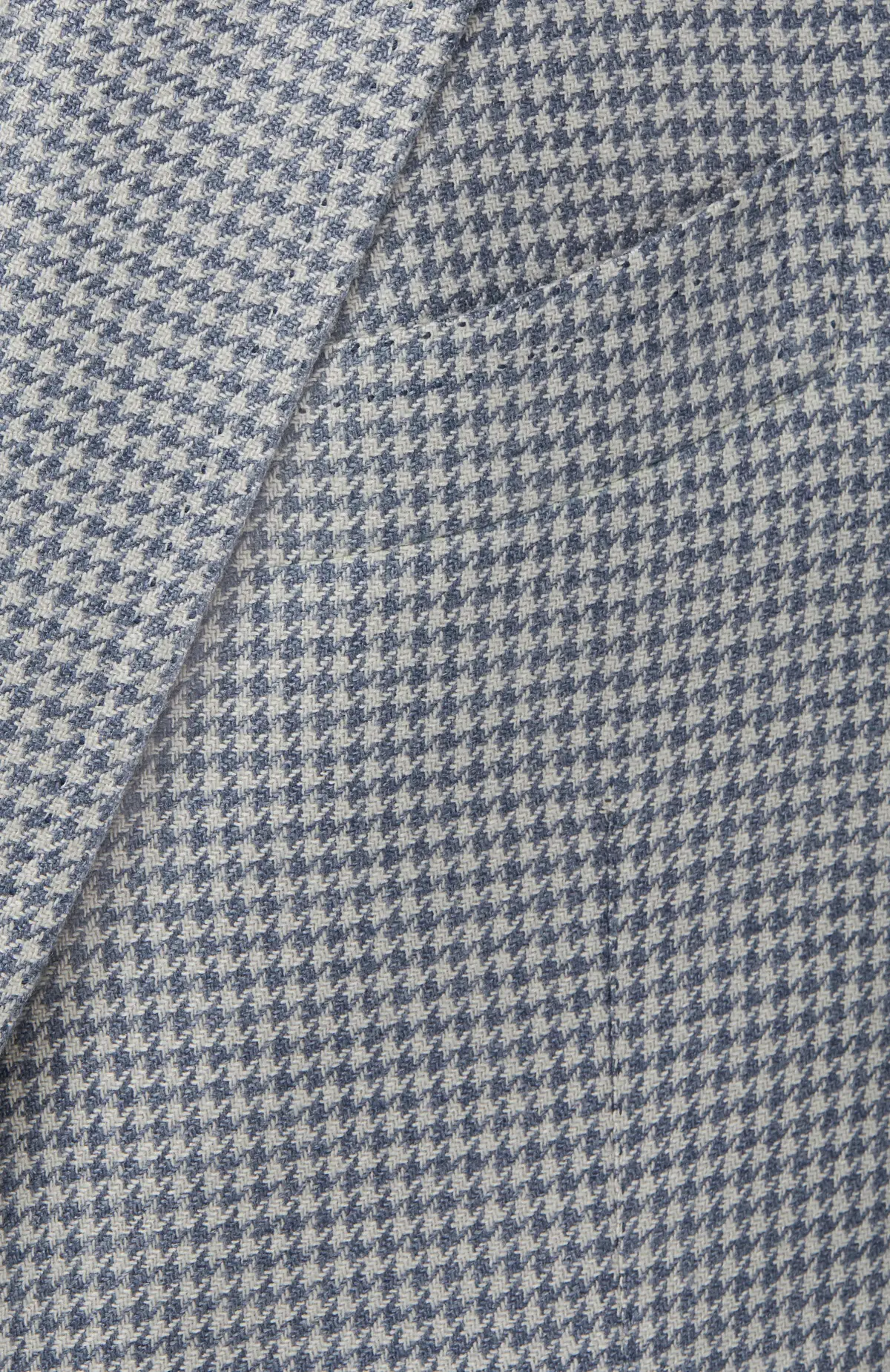 Однобортный пиджак Cesare Attolini из тонкой шерстяной ткани с деликатным узором «гусиная лапка» в серо-голубой гамме. Модель с заострёнными лацканами, накладными карманами и застёжкой на две пуговицы выполнена в лёгкой полуподкладке, что обеспечивает комфорт в течение дня. Идеальный вариант для элегантных летних образов в стиле smart casual.