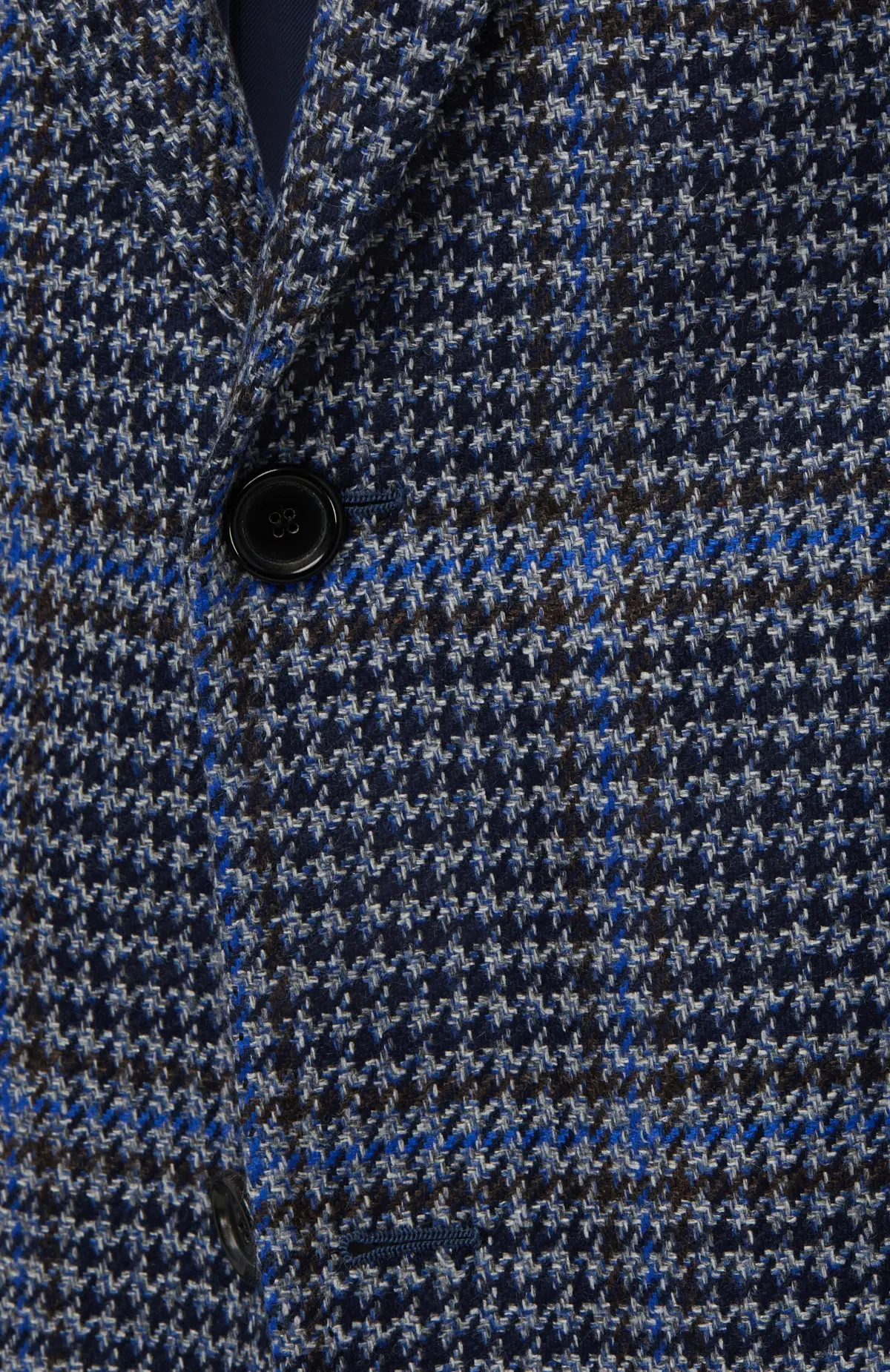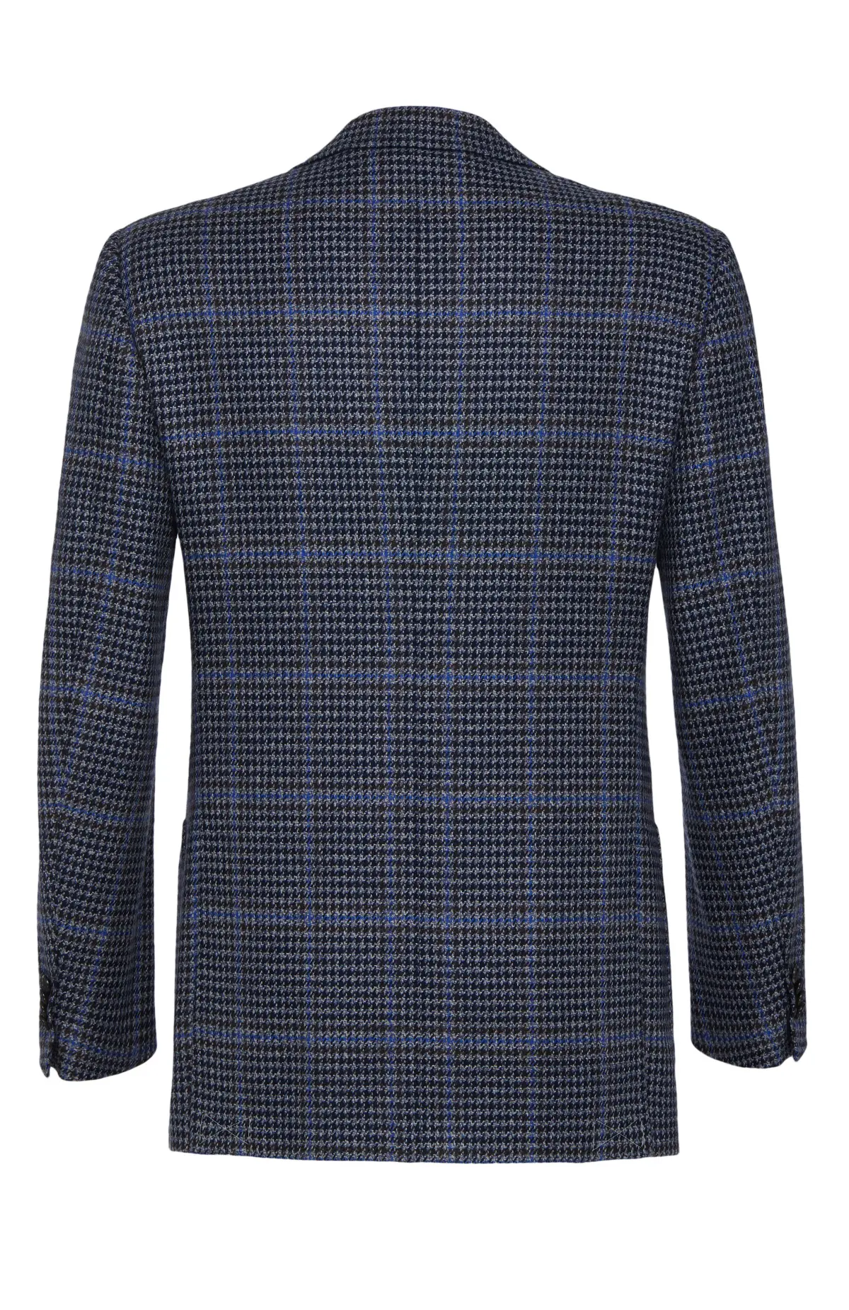 Однобортный пиджак из мягкой шерсти с выразительным сочетанием мелкого «гусиного лапка» и крупной клетки в оттенках синего и графитового. Модель с заострёнными лацканами, накладными карманами и застёжкой на две пуговицы выполнена в фирменном неаполитанском стиле бренда, обеспечивая лёгкую посадку и комфорт в течение дня. Идеальный выбор для элегантных деловых и smart-casual образов.