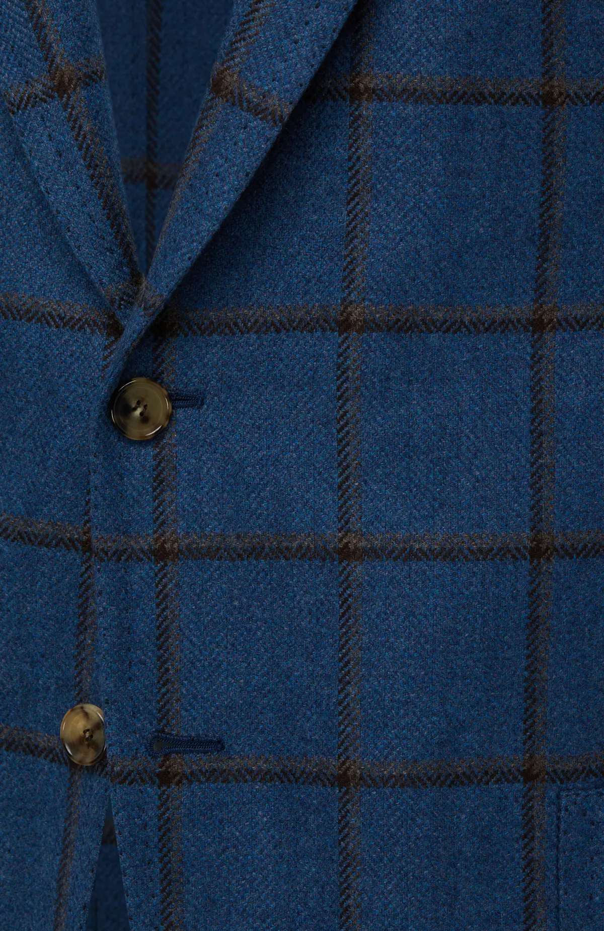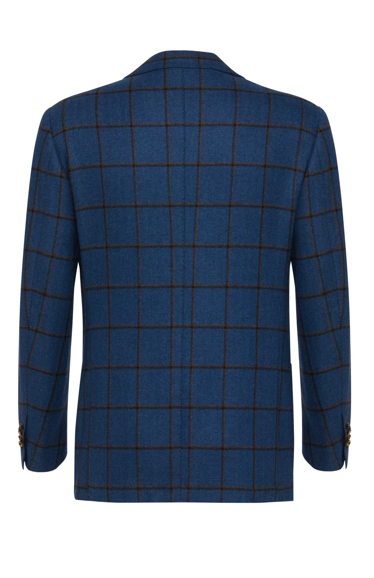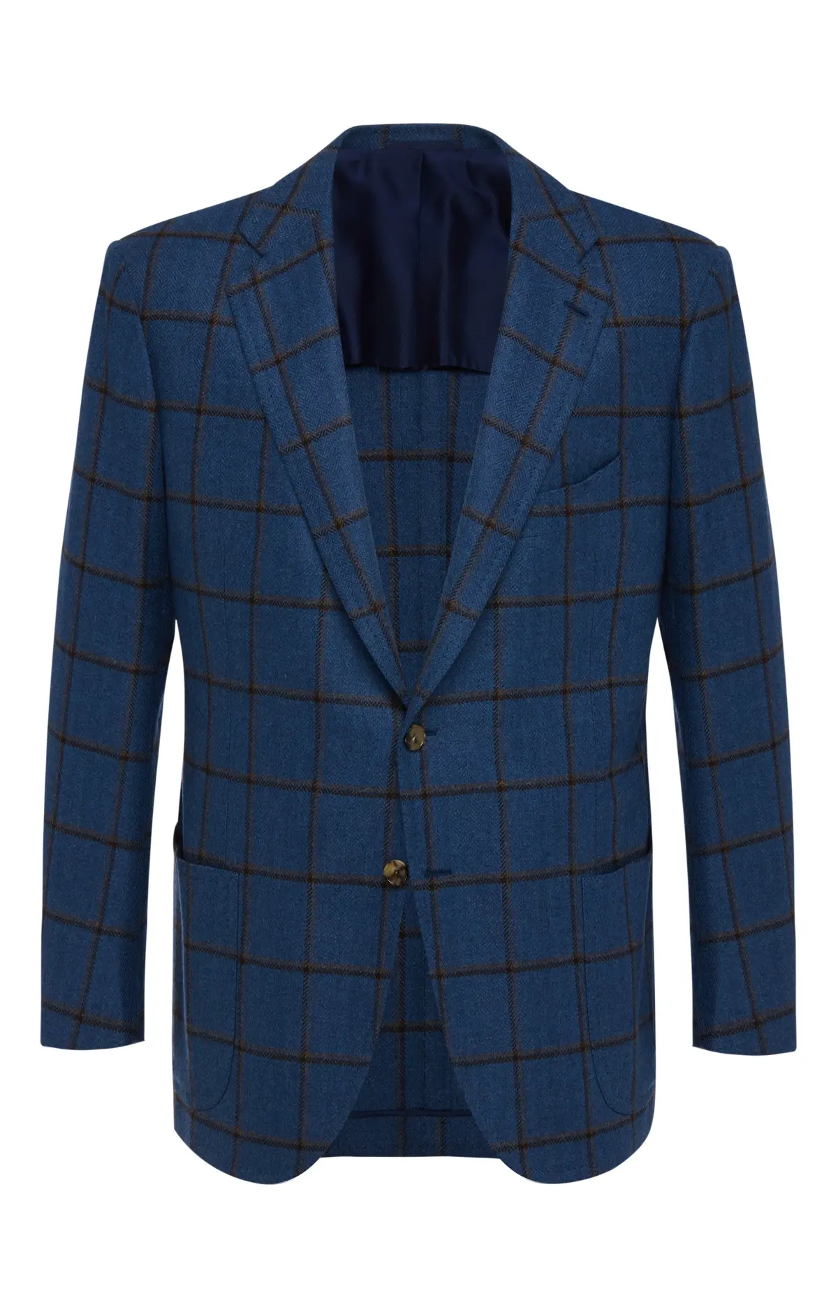 Однобортный пиджак из мягкой шерсти насыщенного синего оттенка с крупной клеткой windowpane в тёплом коричневом тоне. Модель с заострёнными лацканами, накладными карманами и застёжкой на две пуговицы выполнена в фирменной неаполитанской технике мягкого пошива, благодаря чему идеально садится по фигуре и остаётся комфортной в течение дня. Идеальный выбор для элегантных smart-casual образов.