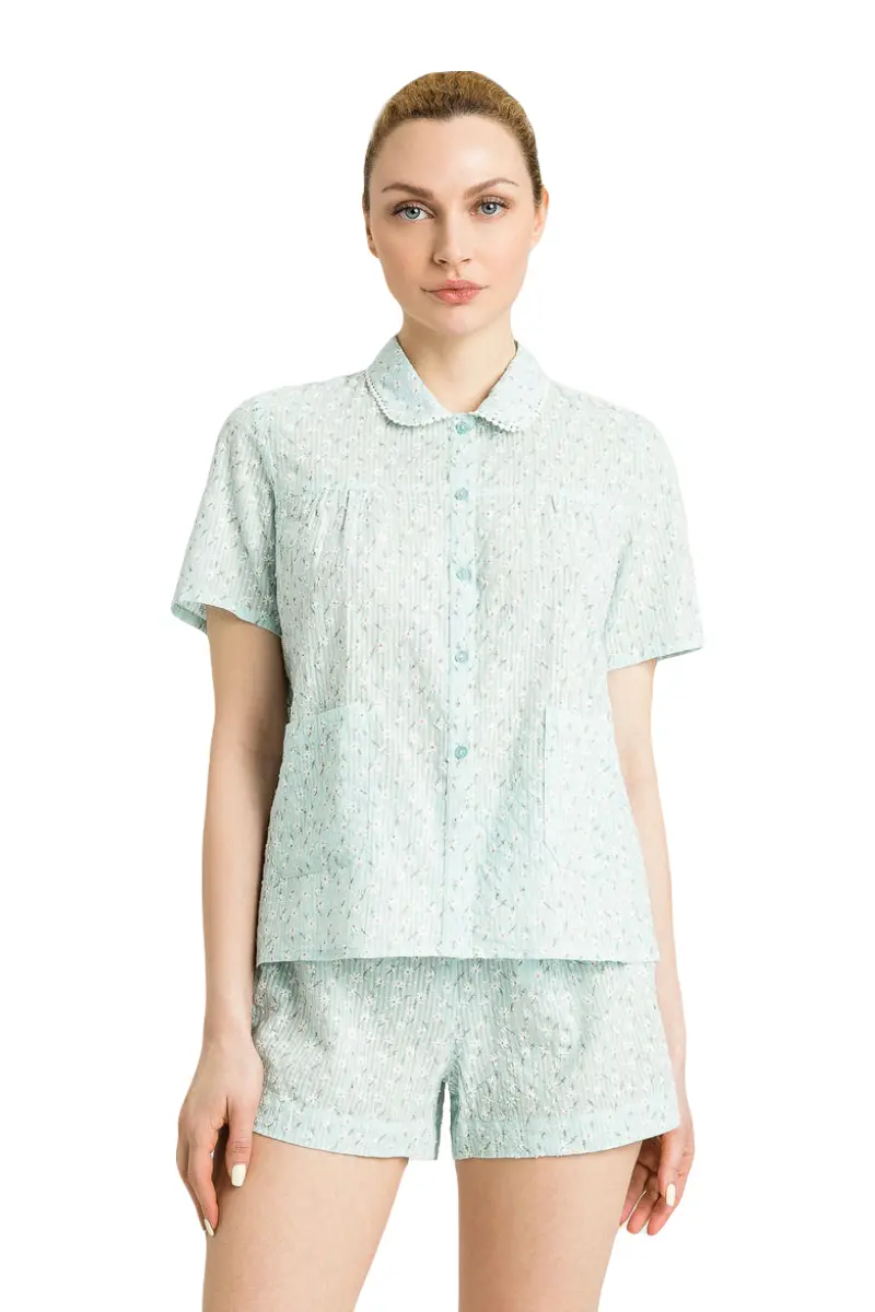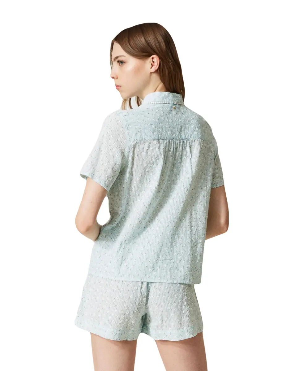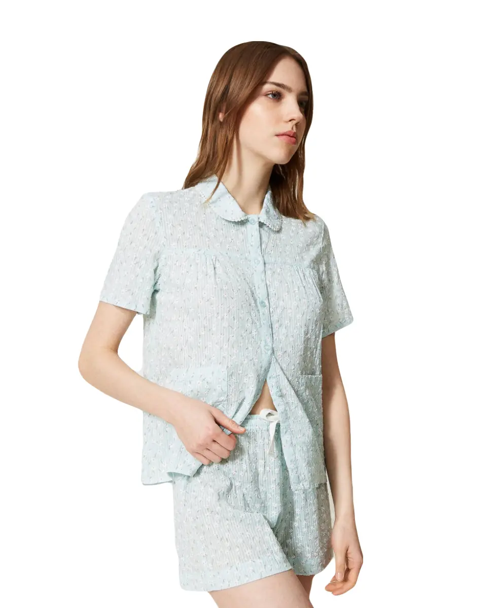 Короткая пижама TWINSET из фактурного хлопка с прорезиненным принтом. Нежные ромашки по всей поверхности изделия придают дополнительную изысканность. Вокруг воротника есть милая окантовка белого цвета. Шорты имеют эластичную талию и хлопковую кулиску с узором «елочка». Идеально подходит для тех, кто любит романтическое ночное белье.