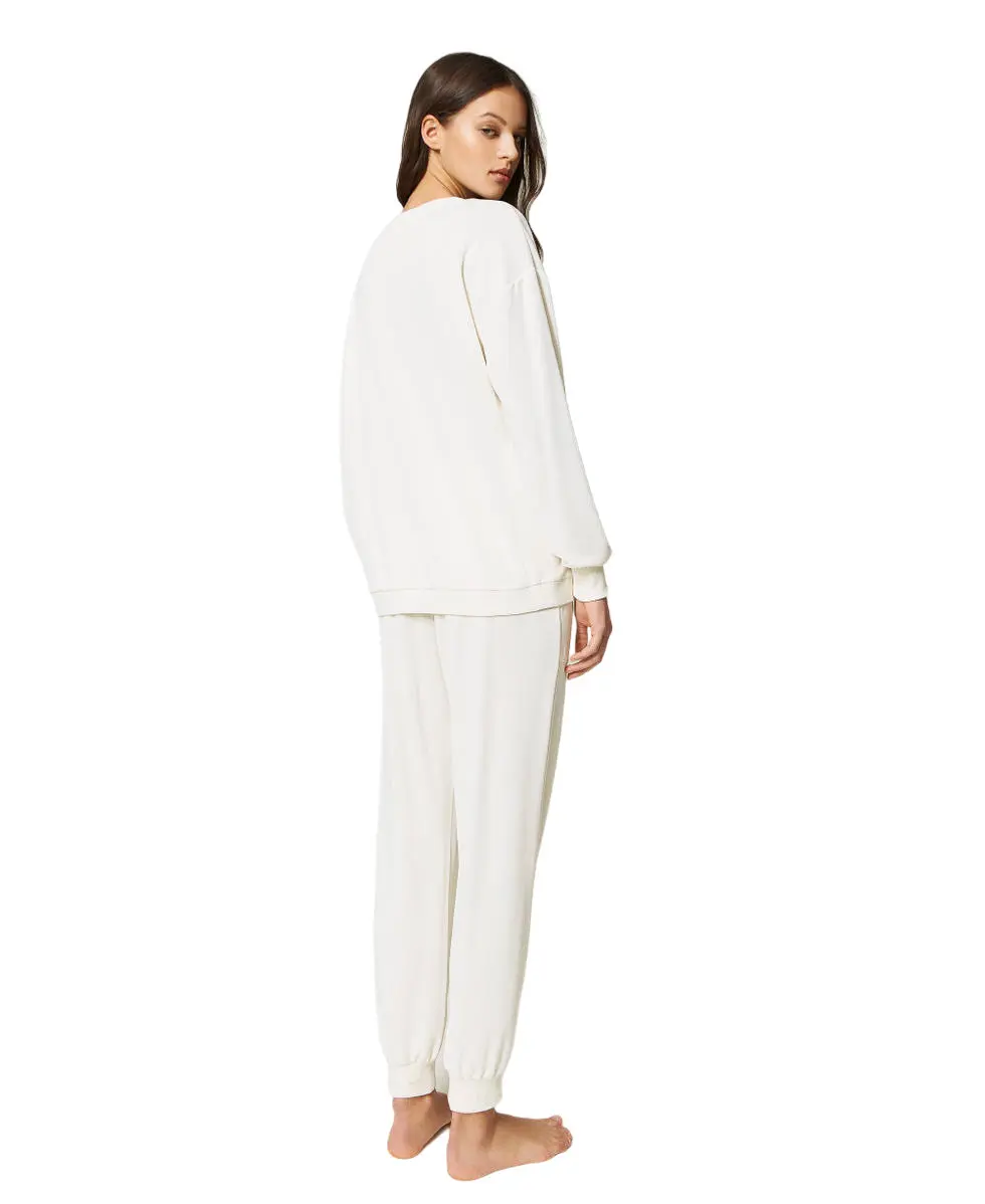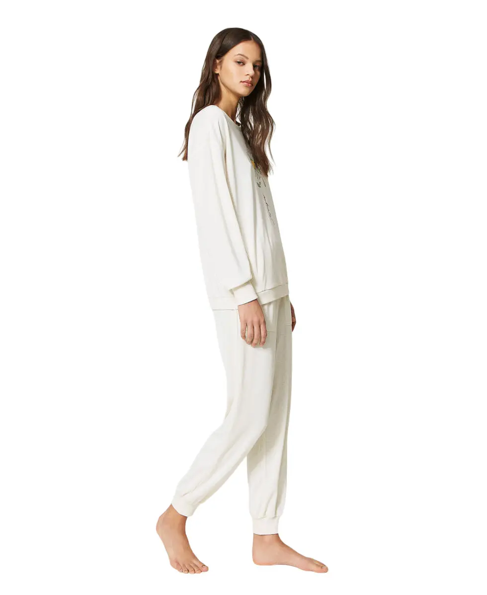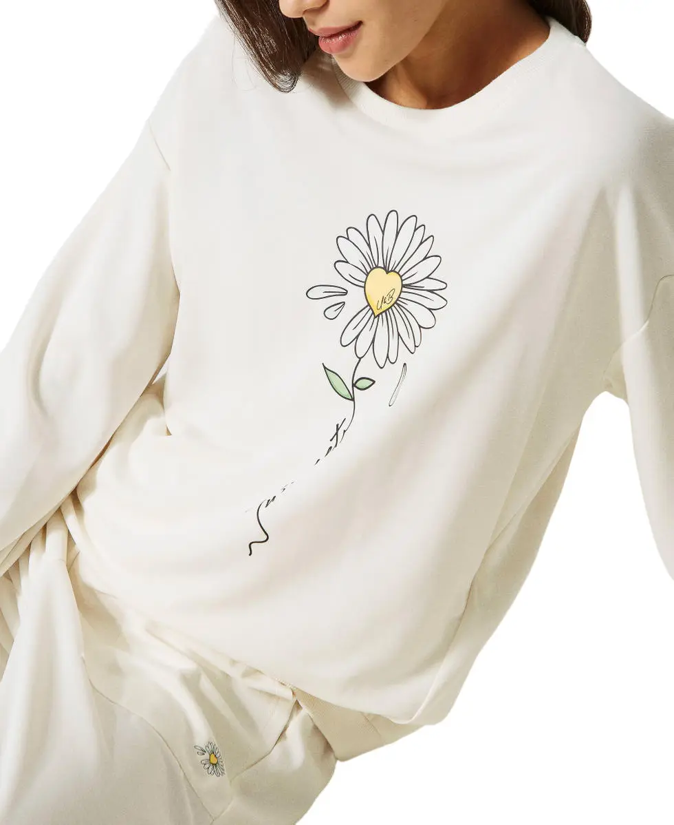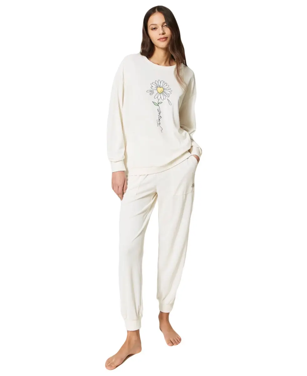 Пижама TWINSET из модального смесового джерси. В комплект входит толстовка с круглой горловиной и принтом в виде ромашки и брюки. Джоггеры имеют потайную резинку на талии, накладные карманы и принт сбоку. Изделие будет также прекрасно смотреться в образе для путешествий.