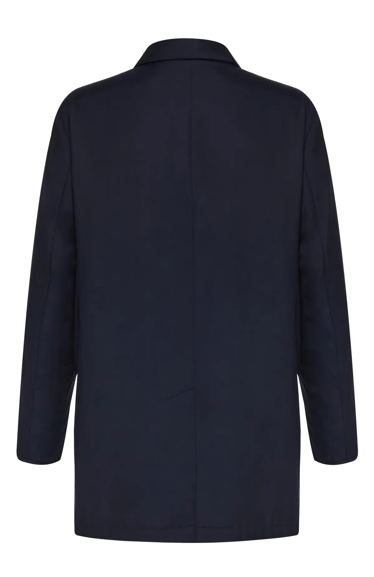 Лаконичный плащ Cesare Attolini выполнен из гладкой темно-синей ткани, устойчивой к ветру и легким осадкам. Прямой силуэт с классическим воротником и застежкой на пуговицы обеспечивает комфортную посадку поверх костюма или пиджака. Универсальная модель подойдёт как для деловых образов, так и для повседневного гардероба.