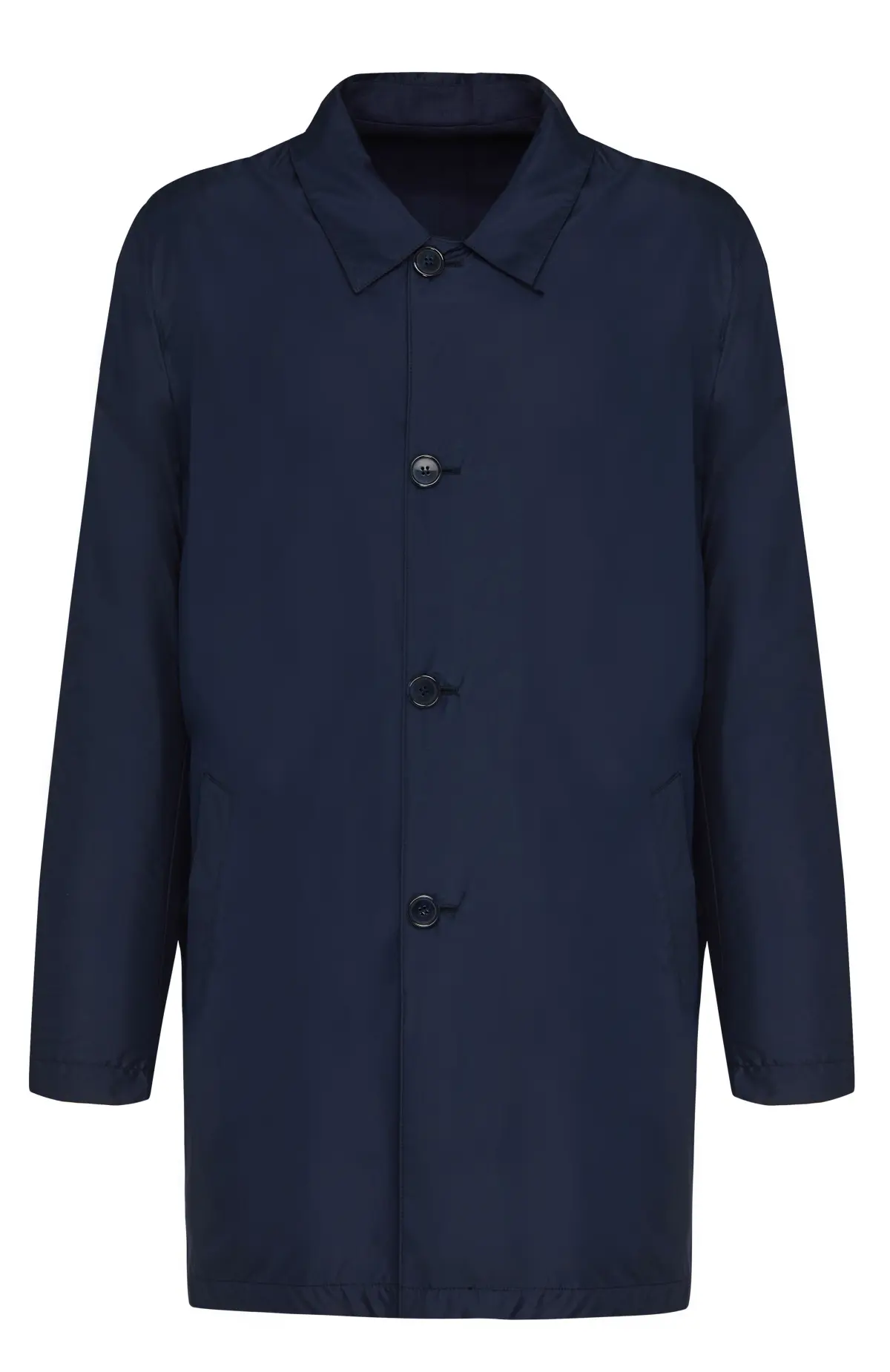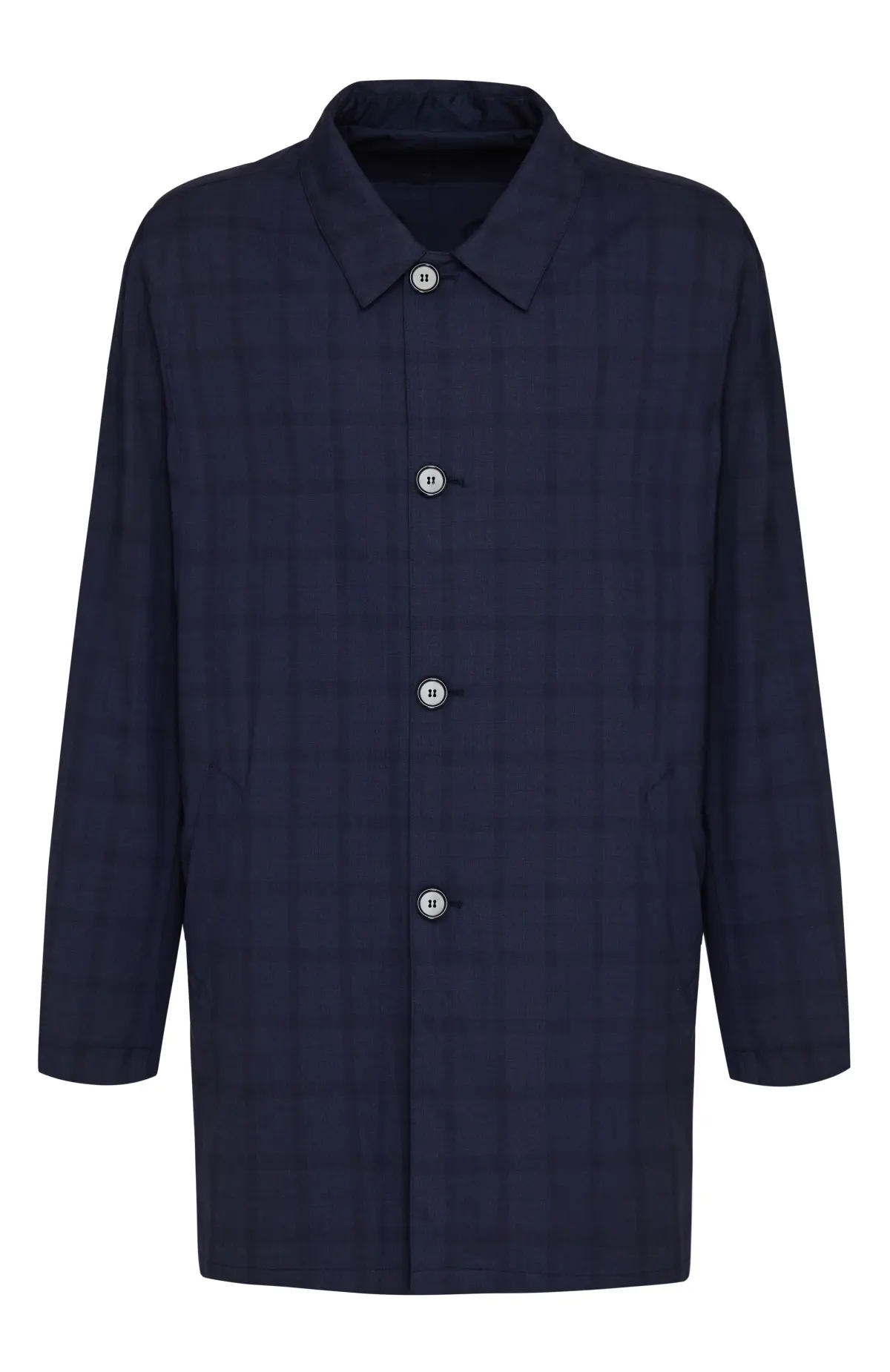 Двухсторонний плащ Cesare Attolini выполнен из легкой водоотталкивающей ткани глубокого синего оттенка. С одной стороны модель лаконичная и однотонная, с другой — декорирована неброским клетчатым рисунком, что позволяет легко менять настроение образа. Прямой силуэт с классическим воротником и потайной планкой на пуговицах подчеркнет безупречный вкус и гармонично дополнит как деловой, так и повседневный гардероб.