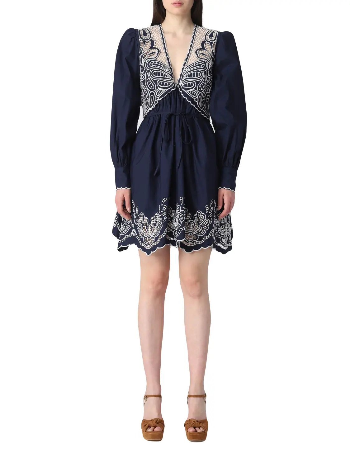 Короткое платье из хлопкового полотна TWINSET с контрастной вышивкой тамбурным швом. Изделие, очаровывающее своей мастерской отделкой, украшено вставками из прозрачной сетки. Оно имеет V-образный вырез, длинные рукава с манжетами и присборенную юбку. Можете носить его как для повседневного аутфита, так и как наряд для торжественного мероприятия.