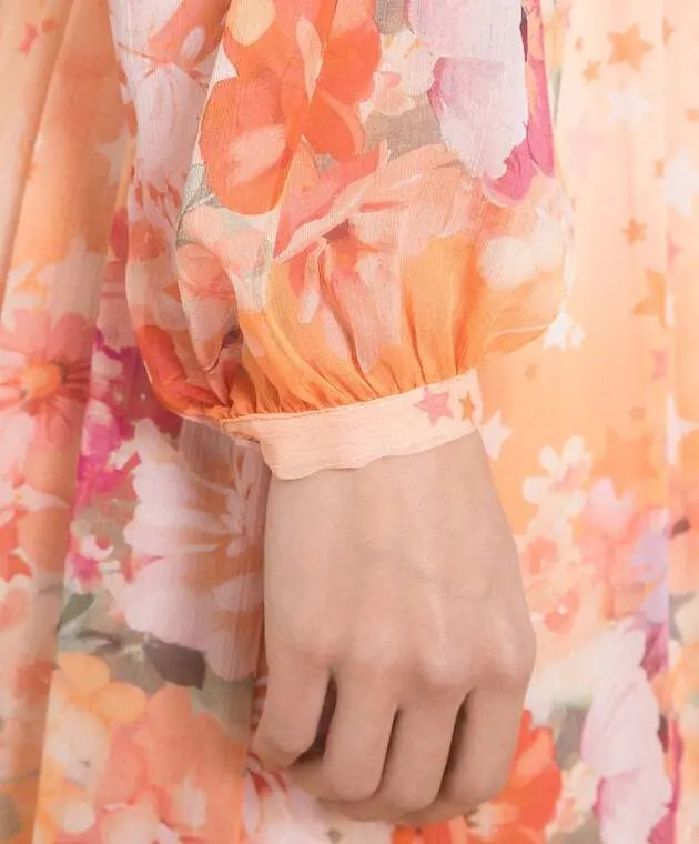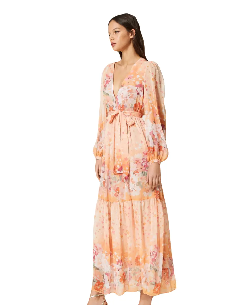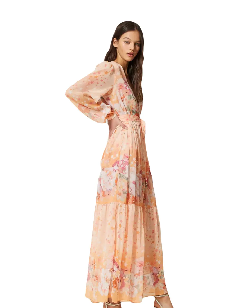 Романтичное и утонченное длинное платье TWINSET из итальянского креп-шифона с принтом в виде цветов и звезд. Оно имеет свободный силуэт, V-образный вырез, рукава со сборкой по пройме,, застежку на молнию сбоку. У модели есть подкладка из крепдешина и пояс в тон. Сочетайте с высокими каблуками и клатчем для особого мероприятия или яркого летнего образа.