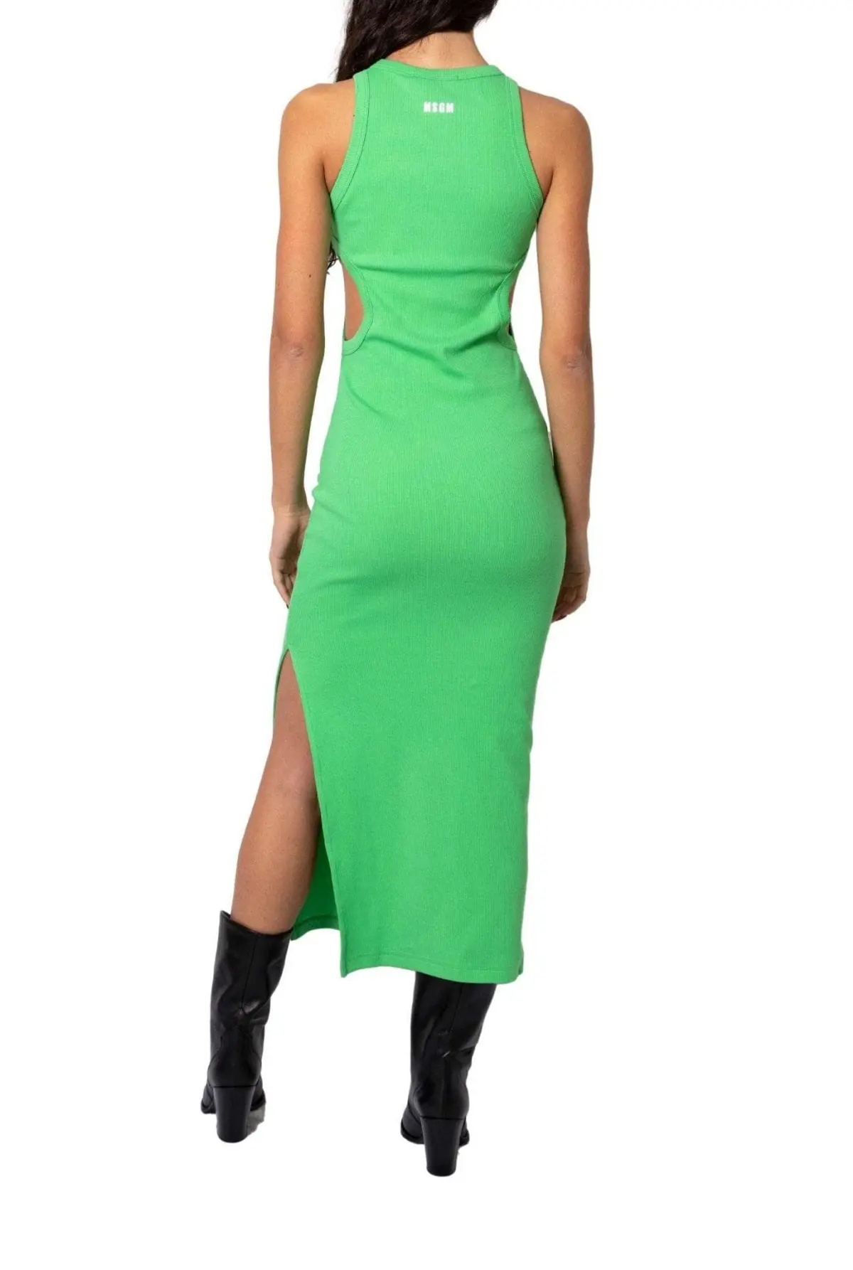 Длинное платье MSGM с вырезами по бокам. Удобный хлопковый материал — тянущийся трикотаж в рубчик отлично подойдет для теплой погоды. Модель имеет мини-логотип сзади и глубокие разрезы сбоку. Платье можно носить как самостоятельное изделие, так и дополнить жакетом.
