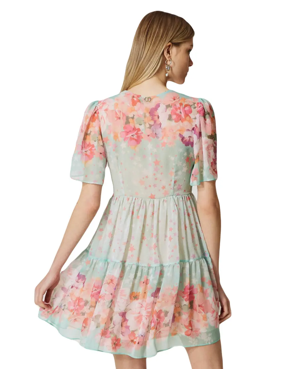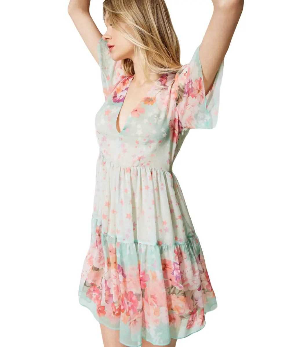 Небесно-голубое платье TWINSET в стиле "бон тон" из итальянского креп-шифона с принтом в виде цветов и звезд. Модель имеет расклешенный фасон, V-образный вырез, рукава со сборкой на плечах и подкладку из жоржета. Носите с высокими каблуками и клатчем в образе для особого мероприятия.