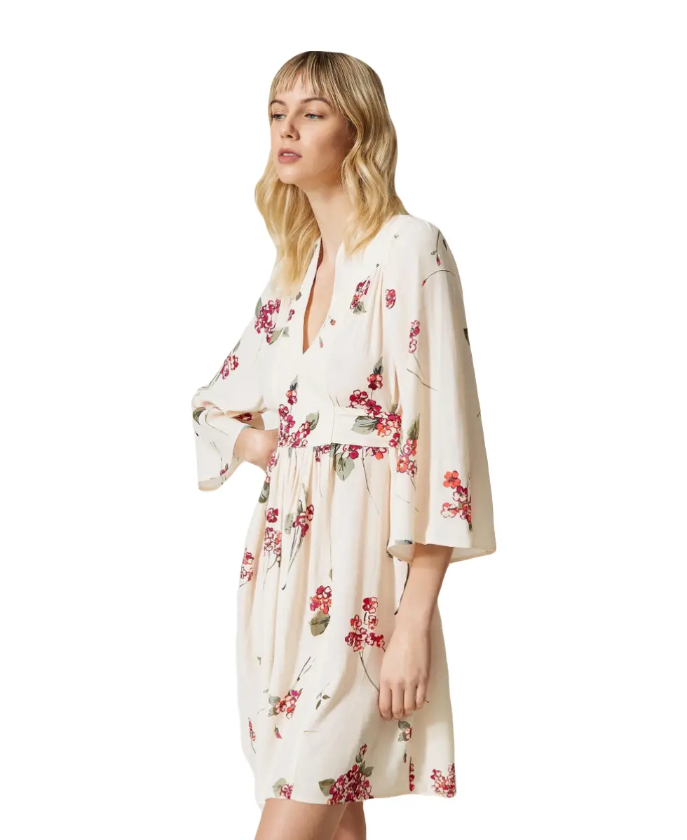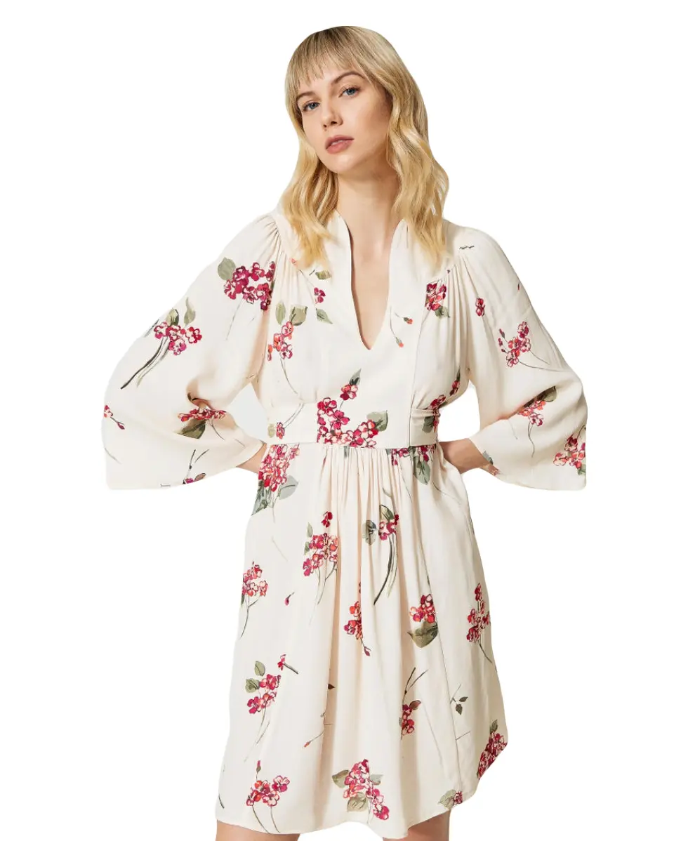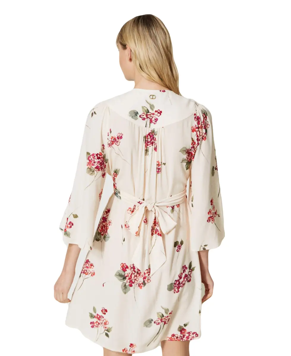 Короткое платье TWINSET из вискозного крепа. Изысканность этому изделию придает букетный узор и эксклюзивный лого-принт. Модель имеет воротник-стойку, глубокий вырез и присборенную талию с поясом-кушаком. Романтичное и универсальное для дня и вечера.