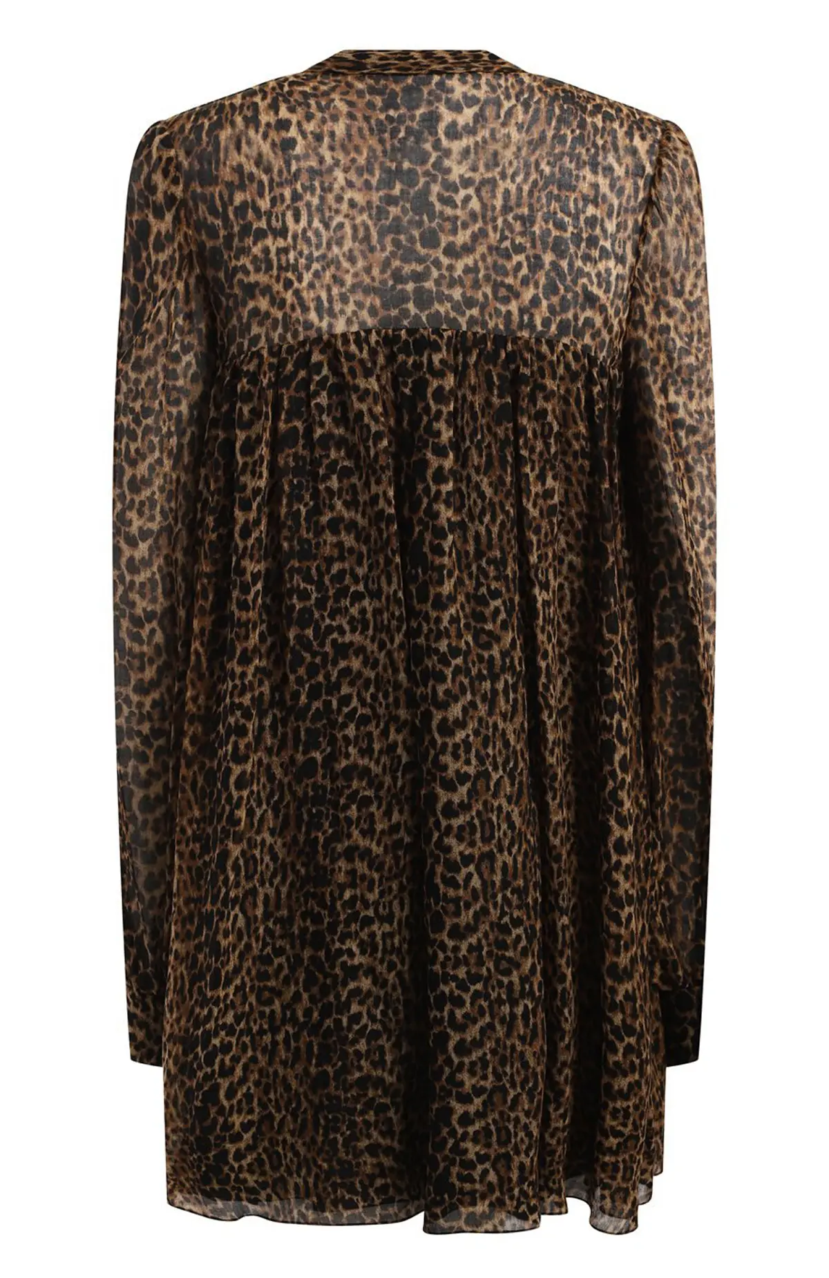 Мини-платье из тонкой шерсти оформлено фирменным леопардовым принтом, создающим выразительный акцент в образе. Свободный силуэт с легкими складками и полупрозрачными рукавами дополняет воротник с длинными завязками, которые можно носить бантом или оставлять распущенными. Модель подойдет как для вечерних выходов, так и для смелых повседневных комбинаций с высокими сапогами или ботильонами.