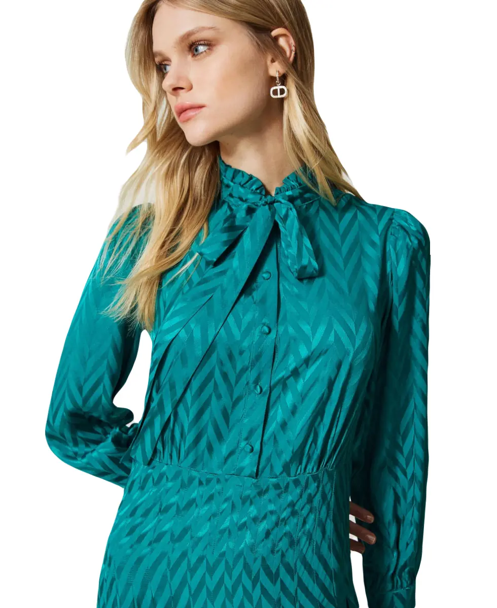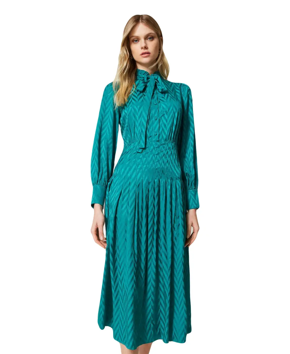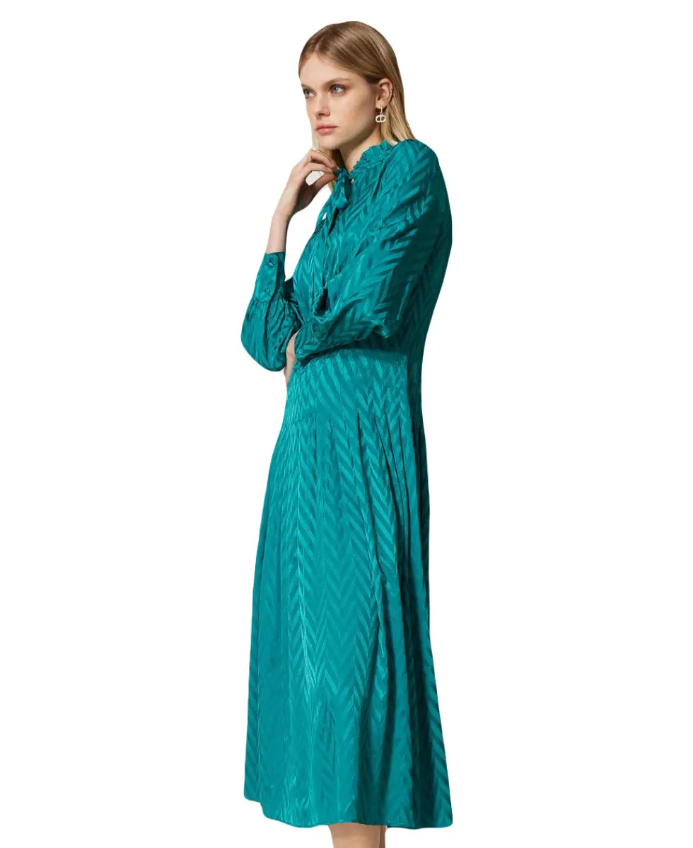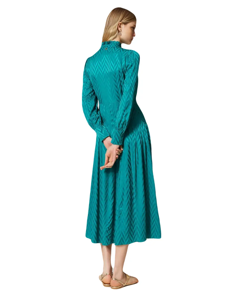Длинное вискозное платье TWINS из жаккардовой вискозы. Изделие с чередующимся блестящим и матовым шевронным узором не оставит равнодушными окружающих. Платье имеет воротник, отделанный рюшами и застежку на обтяжные пуговицы. Юбка платья со складками, застроченными по бокам, а рукава присборены по пройме и заканчиваются манжетами. Подойдет и для работы, и для гламурного вечера — достаточно только сменить аксессуары.