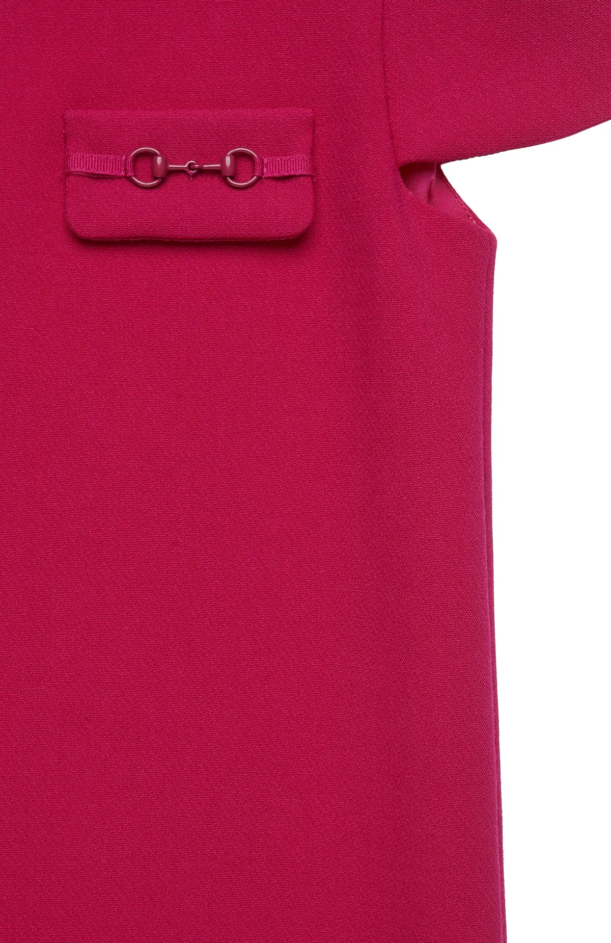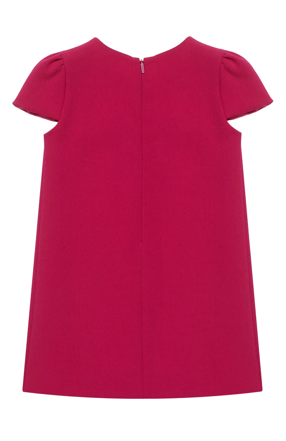 Платье выполнено из гладкого материала, имеет прямой силуэт и лаконичный крой с короткими рукавами и круглым вырезом, застёгивается на молнию сзади и дополнено декоративными карманами с металлической фурнитурой на груди.