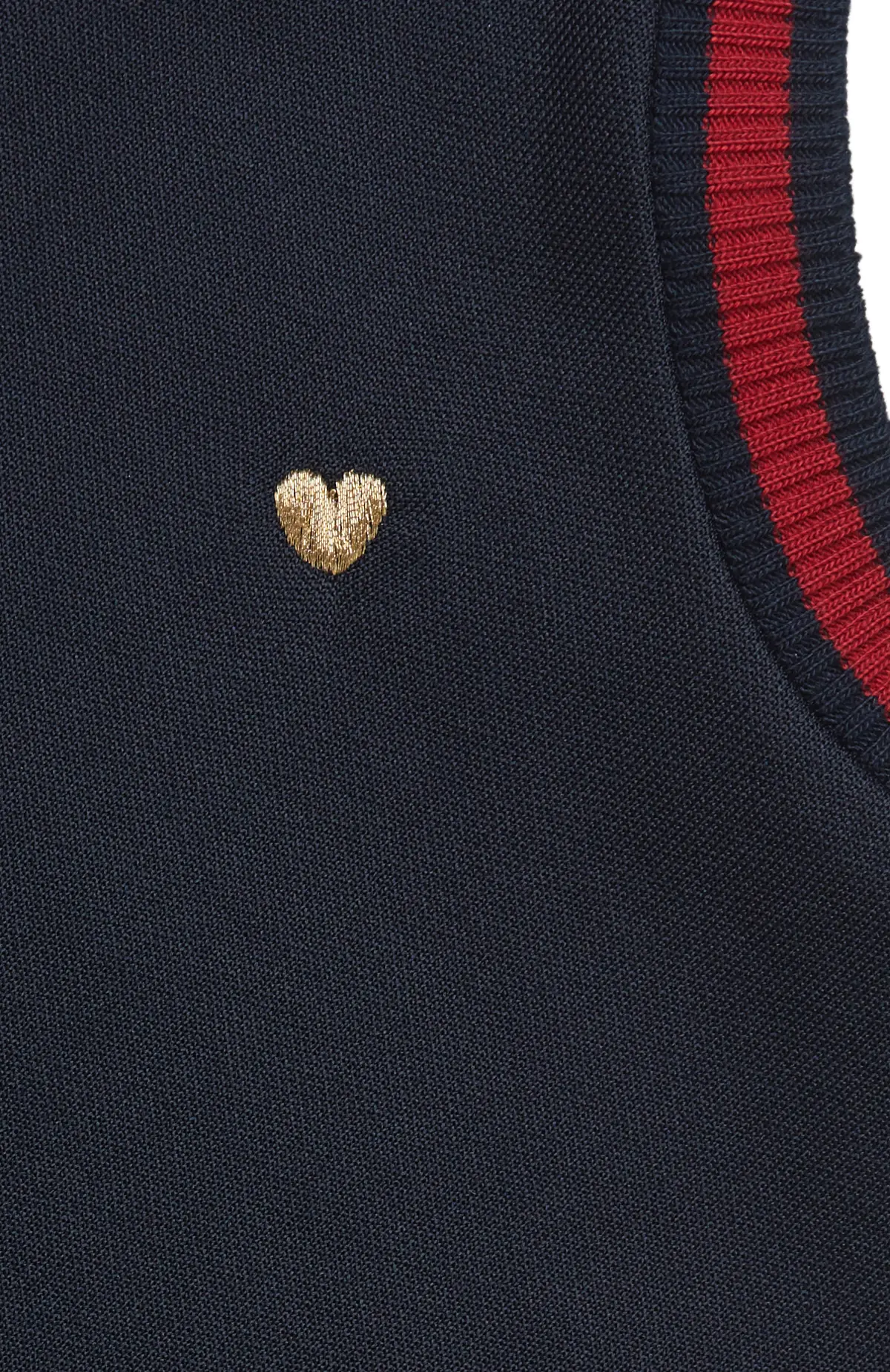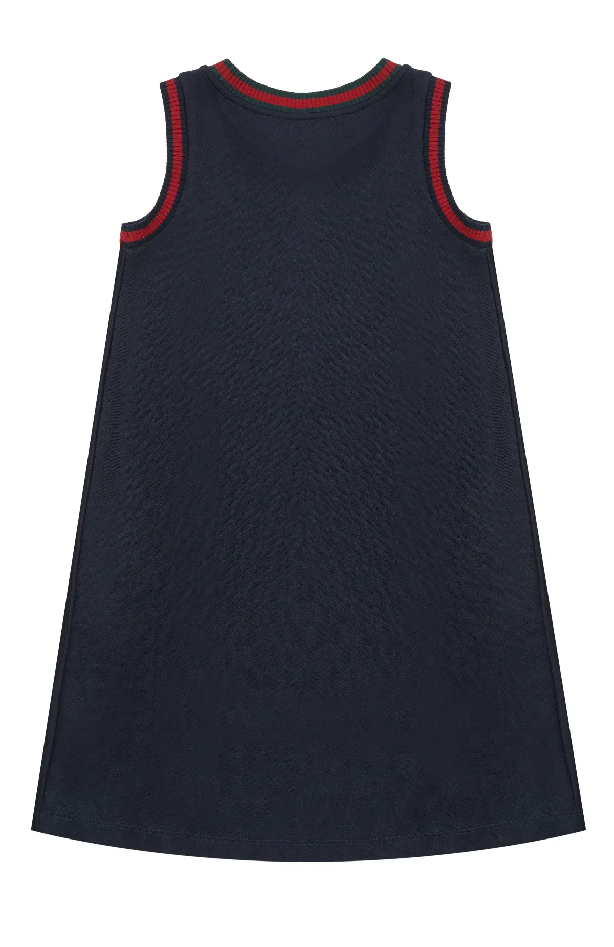 Платье выполнено из плотного трикотажного материала, имеет прямой силуэт без рукавов с круглым вырезом, оформлено контрастной отделкой по горловине и проймам и дополнено аккуратной фирменной вышивкой.