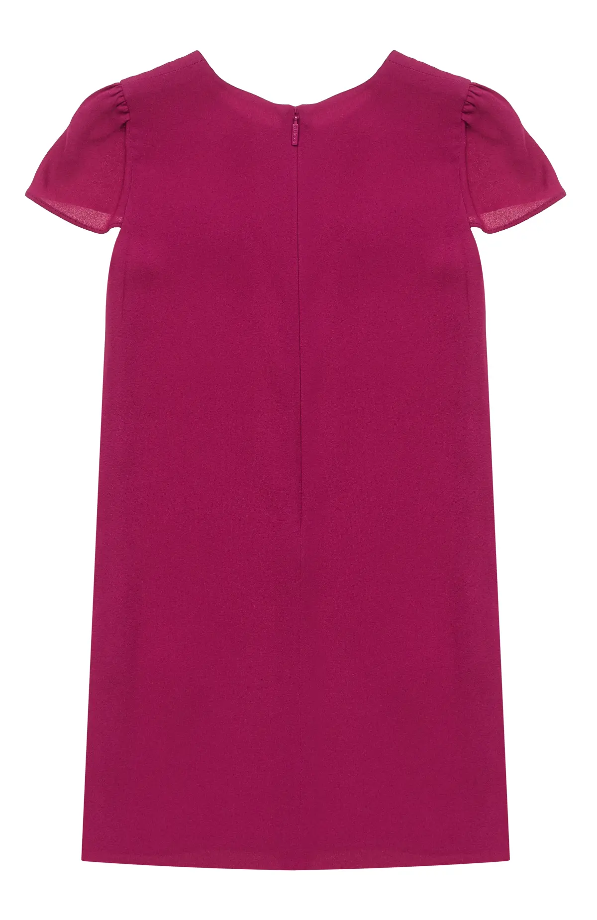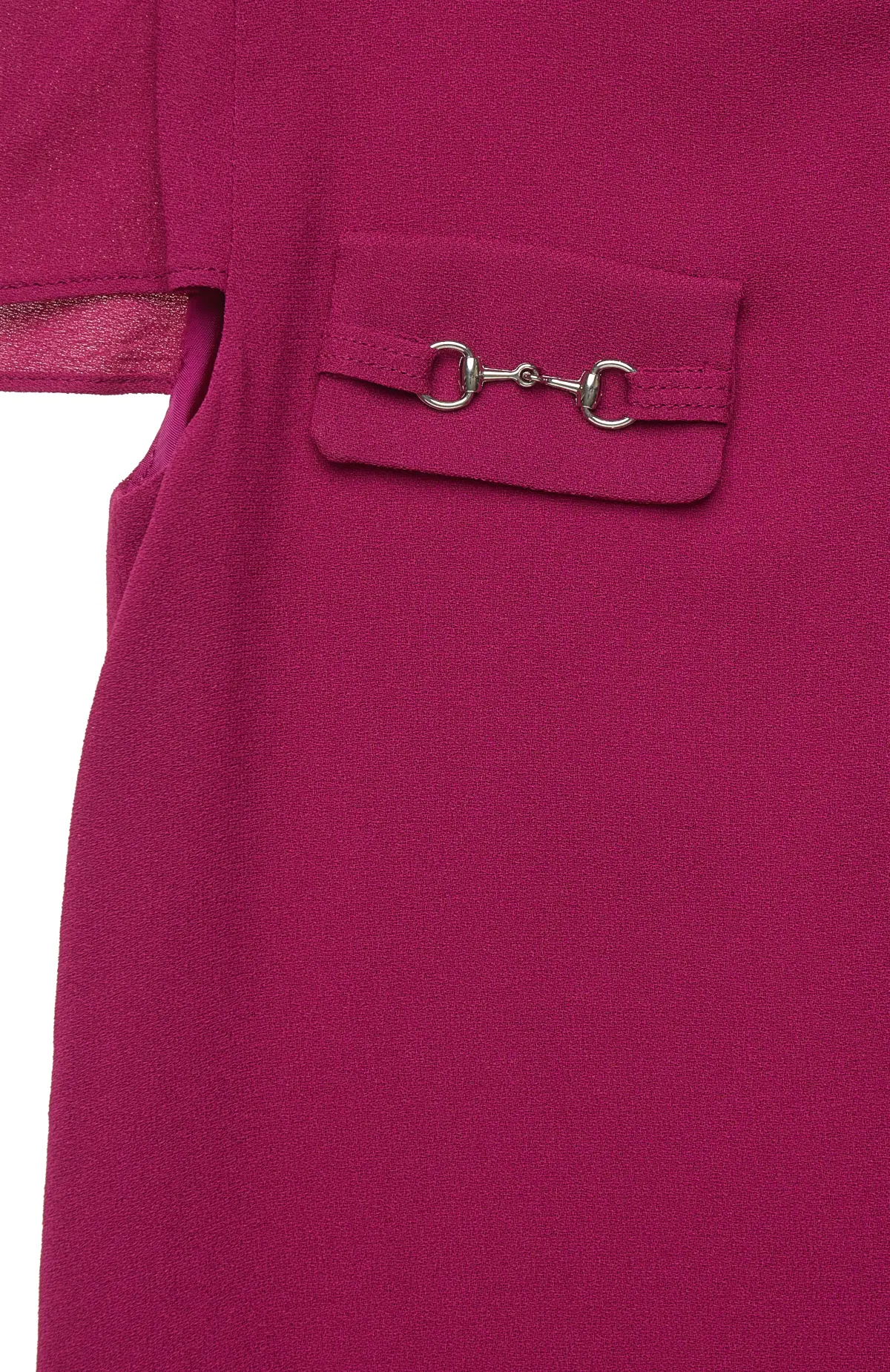 Платье выполнено из гладкого материала, имеет прямой силуэт и лаконичный крой с короткими рукавами и круглым вырезом, застёгивается на молнию сзади и дополнено декоративными карманами с металлической фурнитурой на груди.