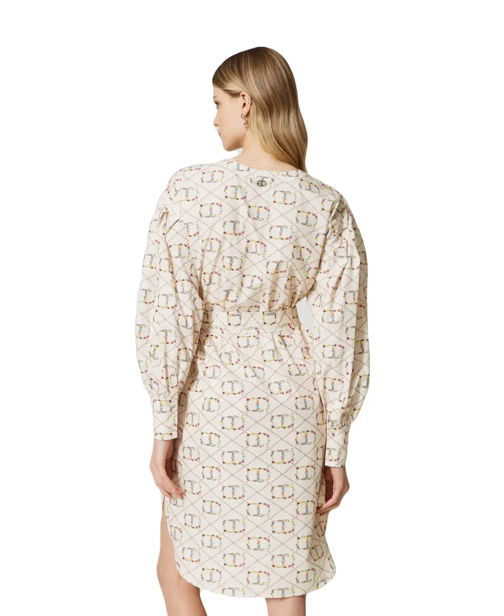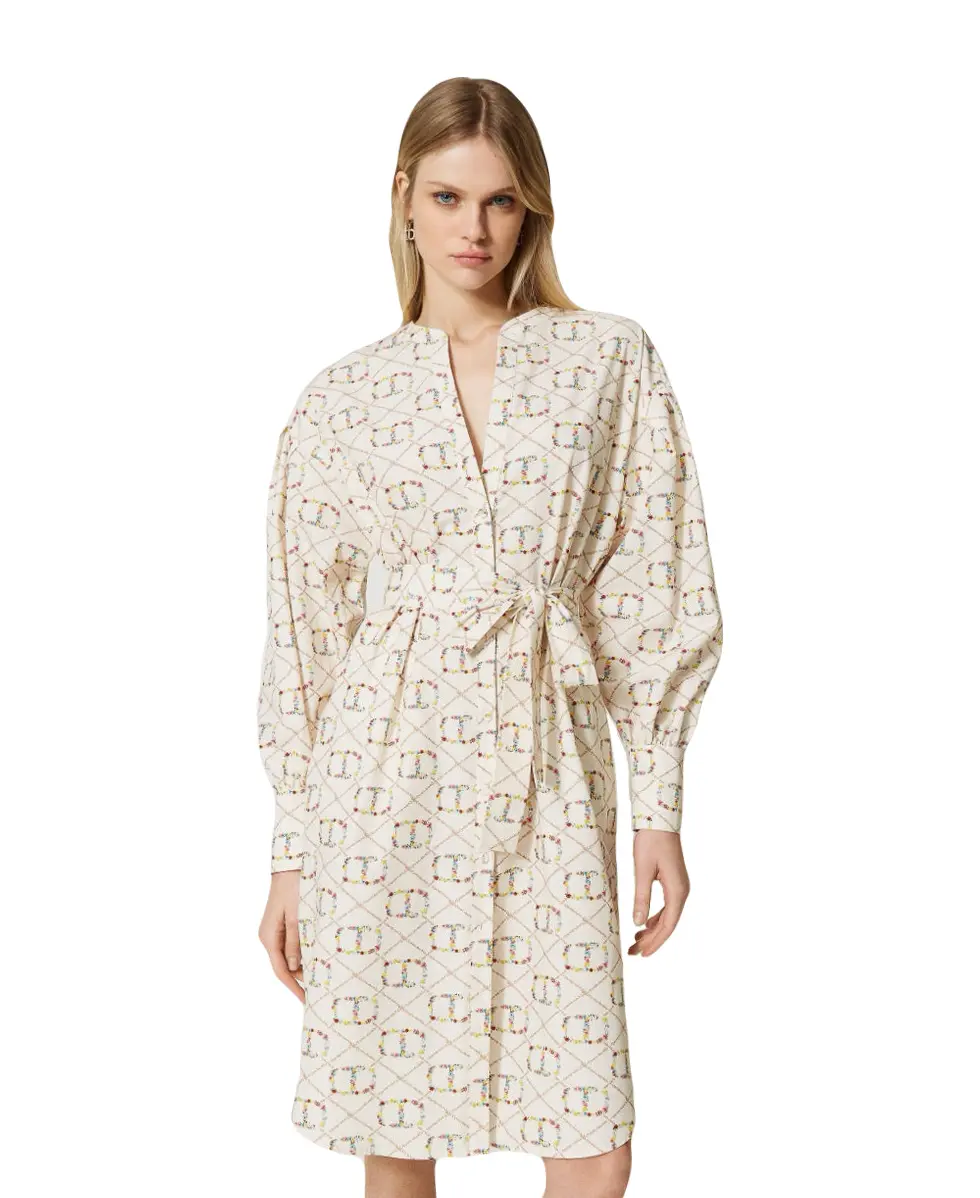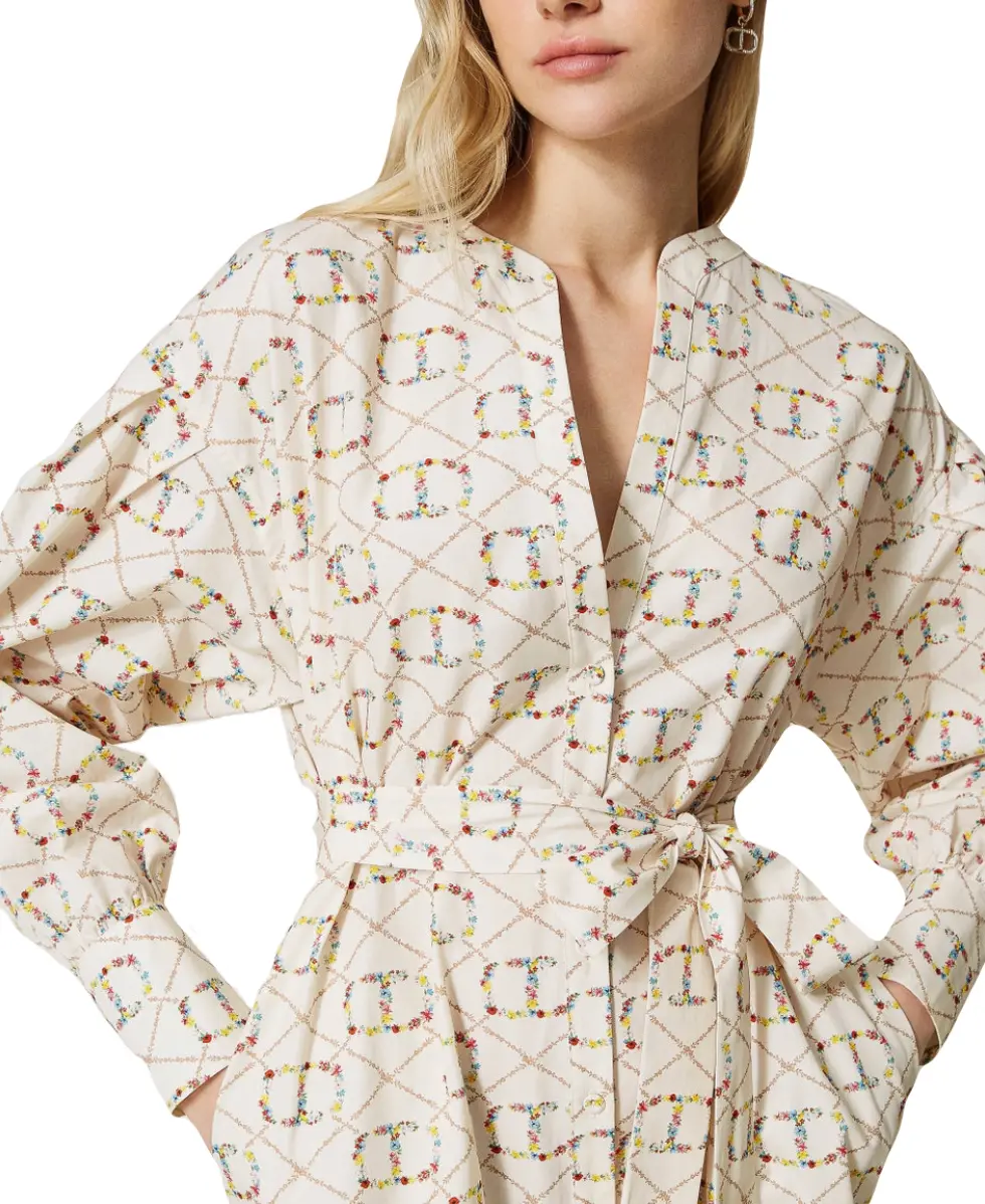 Платье-рубашка TWINSET прямого кроя в бежевом цвете. Логотип Oval T — главный элемент цветочного принта Floral T эксклюзивной разработки бренда. Изделие из хлопкового поплина с романтическим настроением. У модели длинные присборенные рукава, манжеты на обтяжных пуговицах и боковые карманы. Талию можно подчеркнуть с помощью пояса в тон.