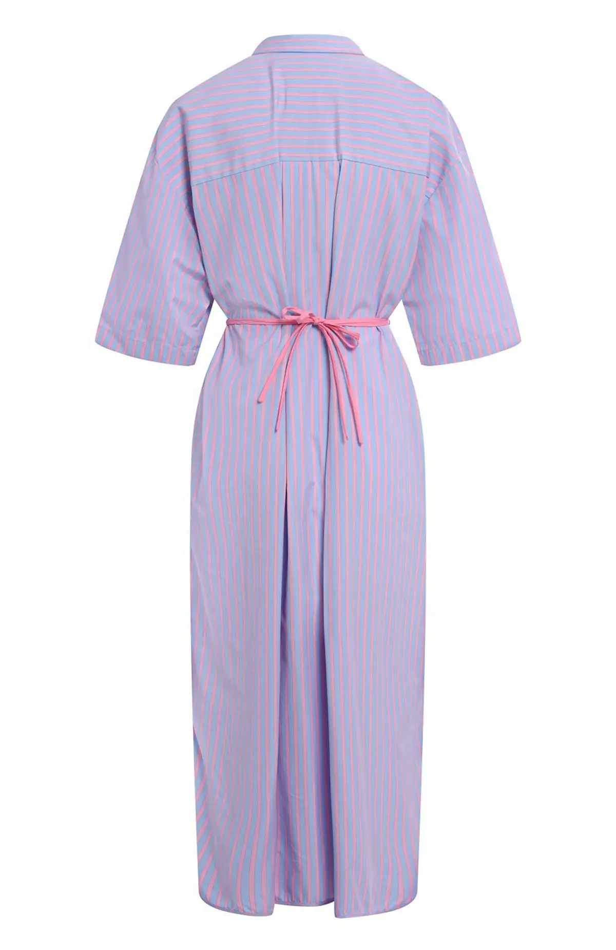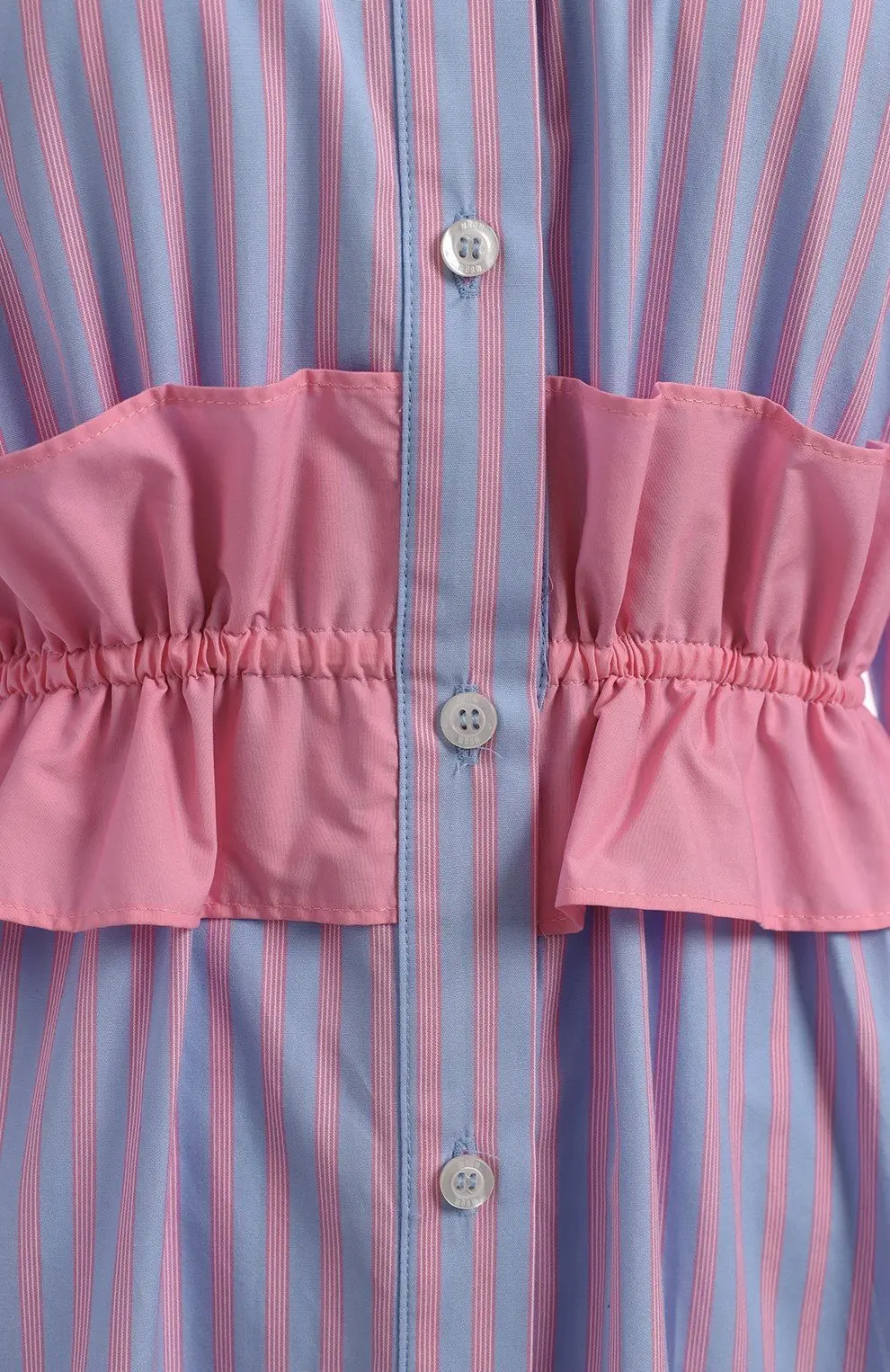Хлопковое платье-рубашка MSGM в тонкую полоску. Спереди на талии — розовая оборка с регулируемой кулиской-лентами. Интересный вид изделия позволяет носить его как на повседневной основе, так и на выход. Сочетайте с балетками, вьетнамками или кроссовками для повседневных выходов в город.