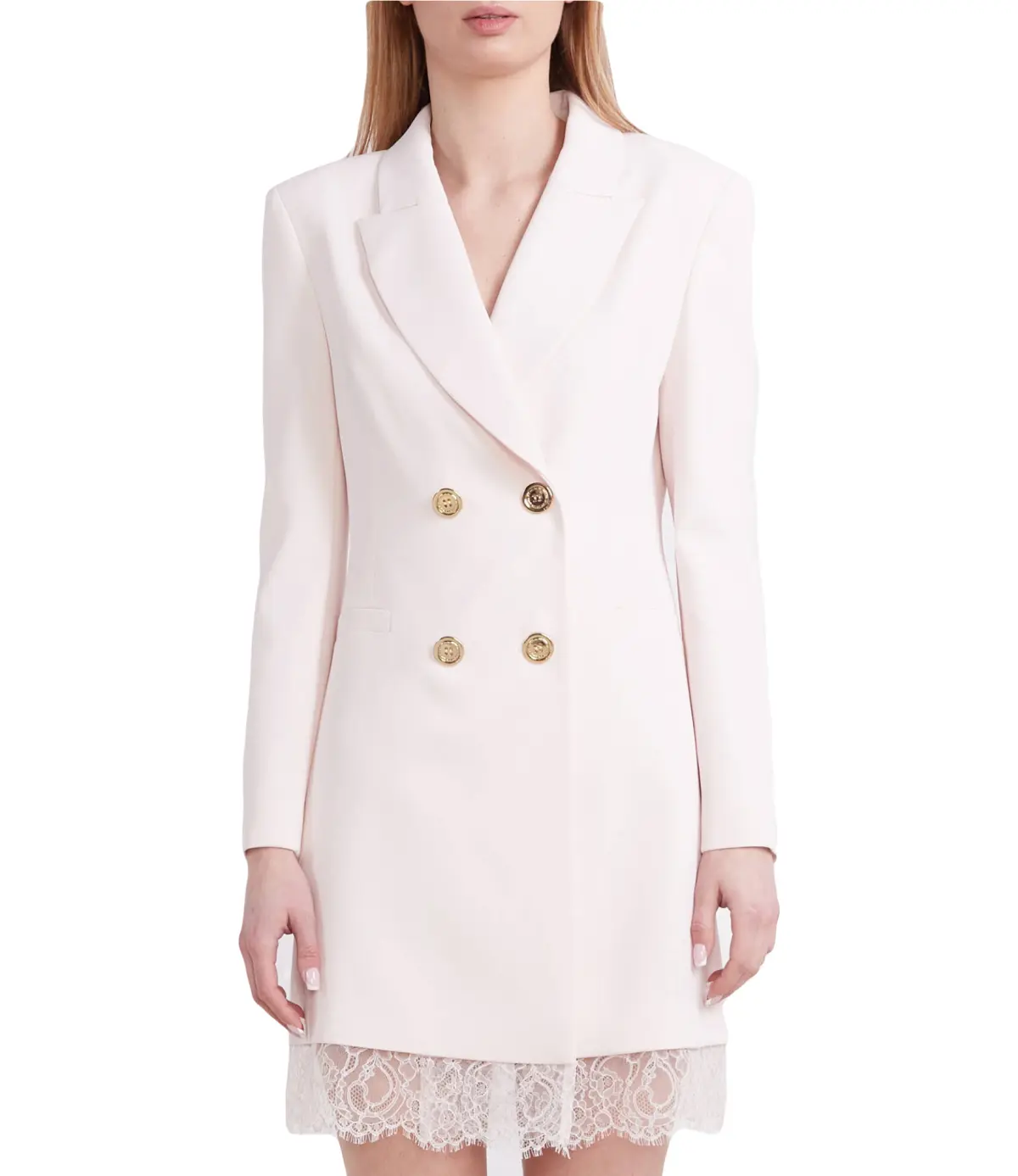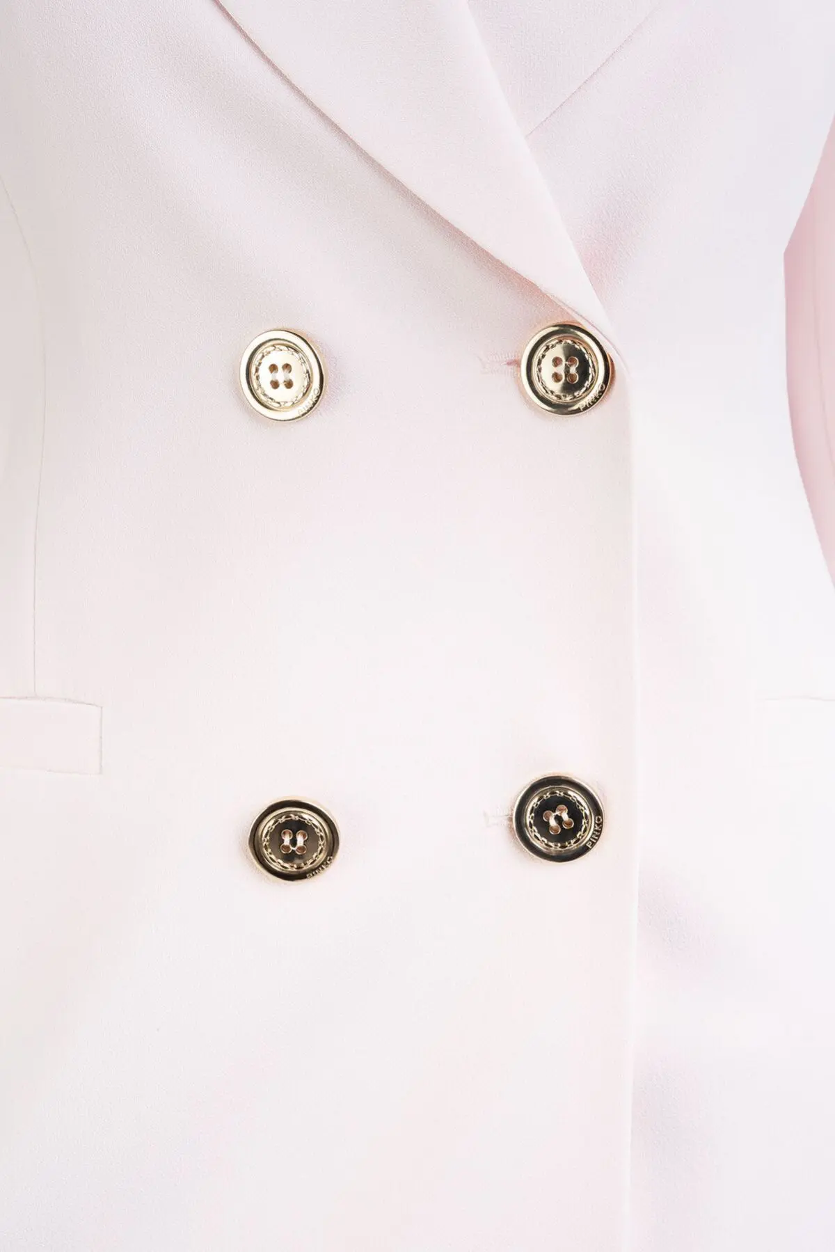 Двубортный жакет-платье Pinko нежно-розового цвета. Модель имеет остроконечные лацканы, золотистые пуговицы, два боковых прорезных кармана. У изделия длинные рукава, длина выше колена и элегантная отделка кружевом по низу. Сочетайте жакет с лодочками и белой сумкой Pinko для создания романтичного образа.