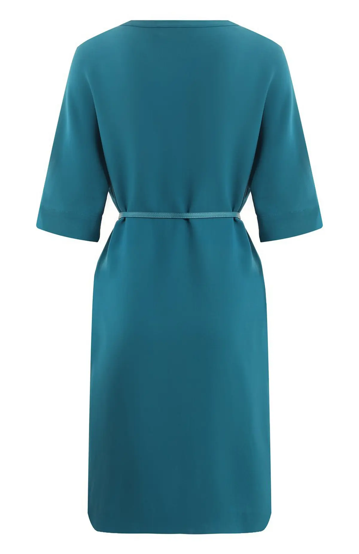 Шёлковое платье Loro Piana выполнено в насыщенном бирюзовом оттенке. Лаконичный прямой силуэт дополняется мягким поясом на талии, подчёркивающим женственность образа. Гладкая фактура шёлка придаёт изделию благородный блеск, а минималистичный вырез и укороченные рукава создают гармоничное сочетание элегантности и комфорта — идеальный выбор для дневных и вечерних выходов.