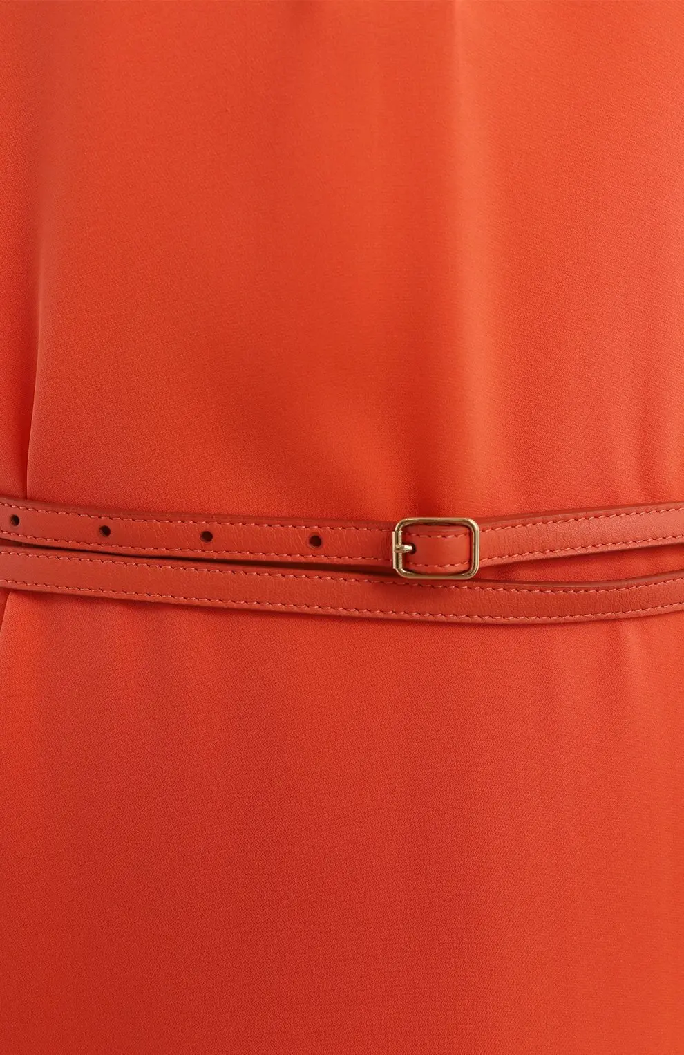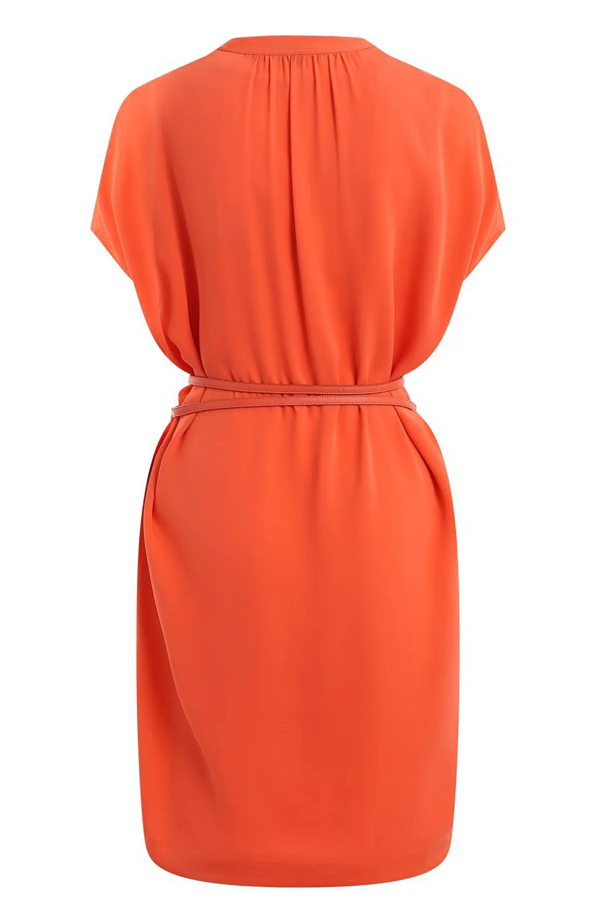 Шёлковое платье Loro Piana в ярком оттенке апельсина воплощает лёгкость и утончённый комфорт. Мягкий натуральный шёлк красиво драпируется, придавая образу непринуждённую элегантность. Модель с короткими рукавами и разрезом у горловины подчёркивает женственность, а тонкий пояс акцентирует талию. Идеальный выбор для летнего дня или неформального вечера.