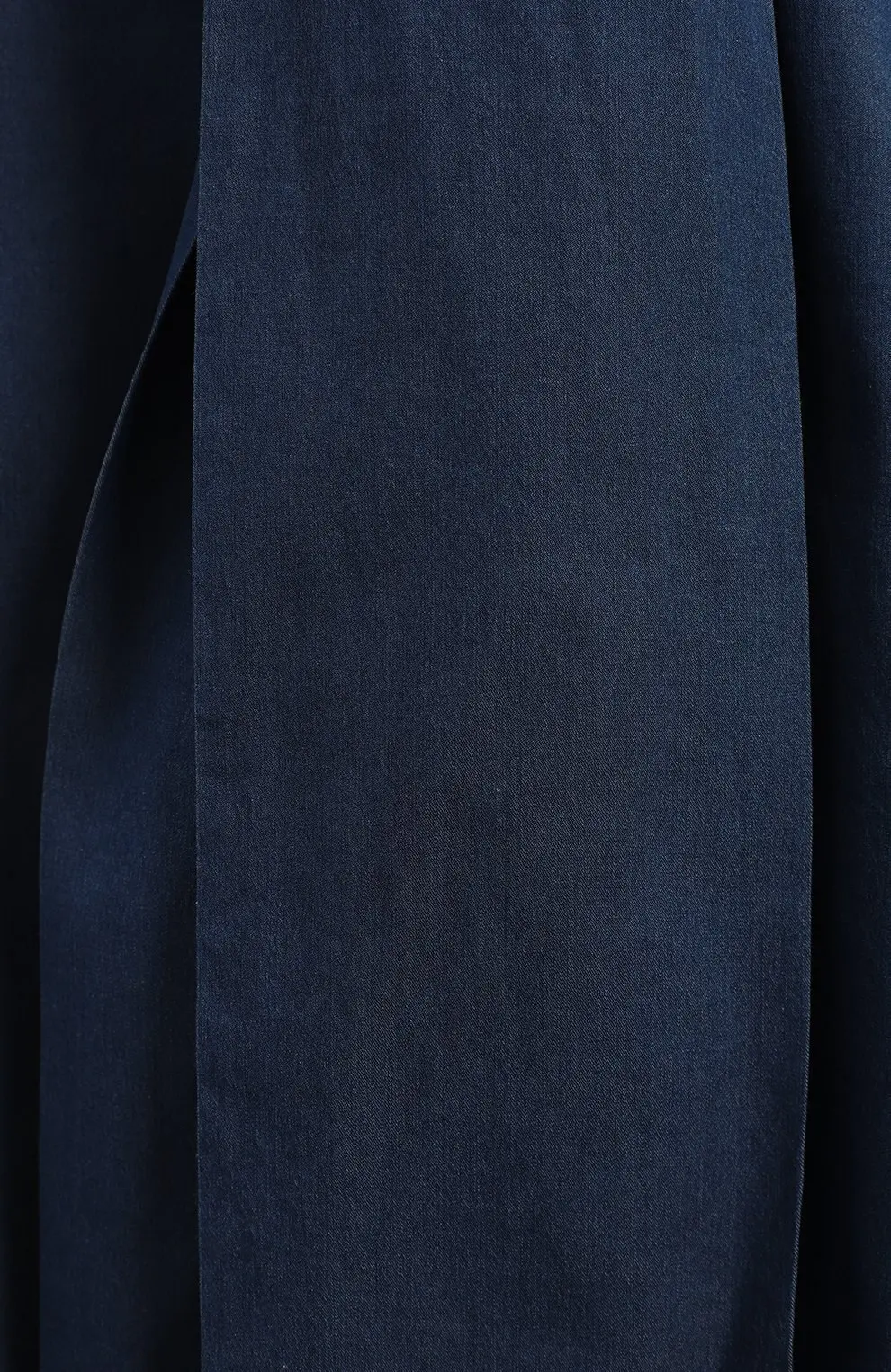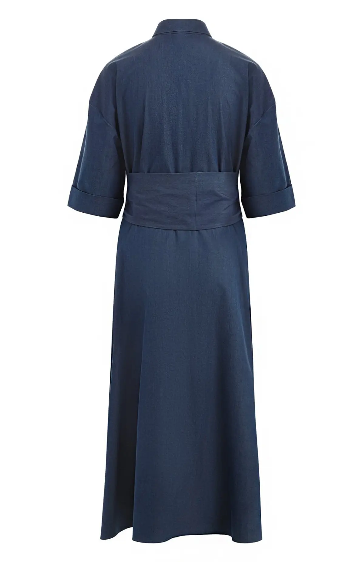 Хлопковое платье Loro Piana в насыщенном синем оттенке выполнено из легкой и дышащей ткани. Модель в стиле рубашки с акцентом на талии благодаря широкому поясу подчеркивает фигуру, сохраняя при этом расслабленную элегантность. Отложной воротник и укороченные рукава придают образу лаконичный, современный характер — идеальный выбор для повседневного шика.