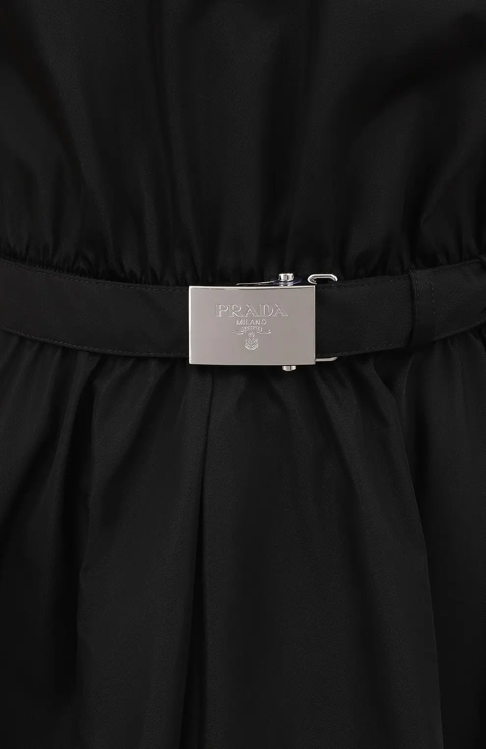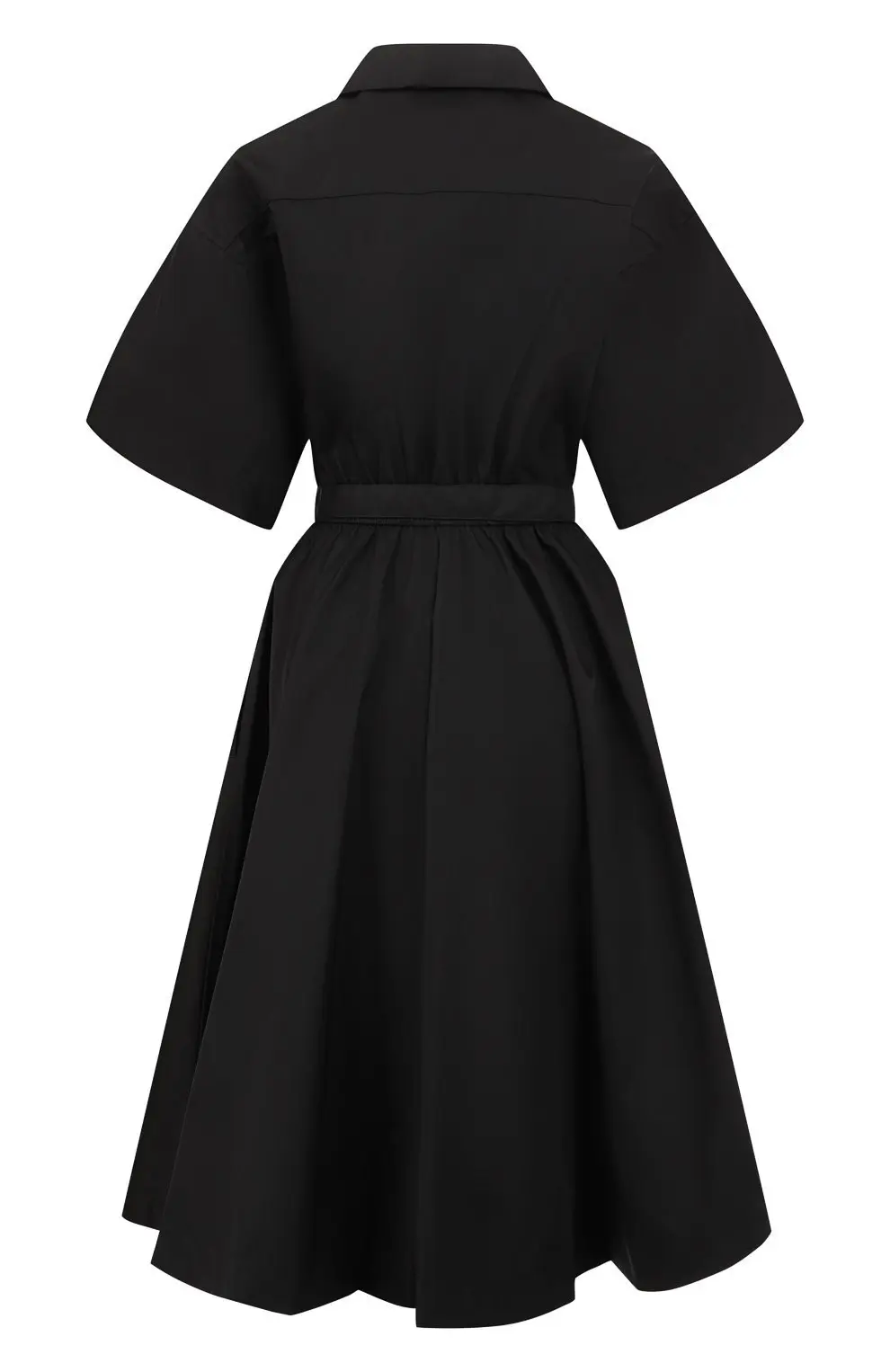 Платье выполнено из плотной технической ткани с матовой фактурой, хорошо держащей форму. Модель с отложным воротником и короткой молнией спереди сочетает лаконичный дизайн и функциональные детали. Короткие рукава и приталенный крой подчёркиваются поясом с металлической пряжкой, формируя женственный силуэт. Расклёшенная юбка миди придаёт образу динамику и элегантность. Универсальный вариант для современных городских образов.