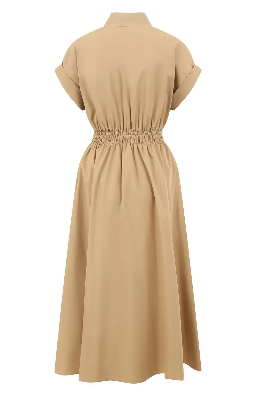 Платье выполнено из плотного хлопка с гладкой текстурой. Модель рубашечного кроя с отложным воротником и застёжкой на пуговицы выглядит лаконично и аккуратно. Эластичная линия талии формирует женственный силуэт, а короткие рукава с подворотами добавляют образу лёгкость.
