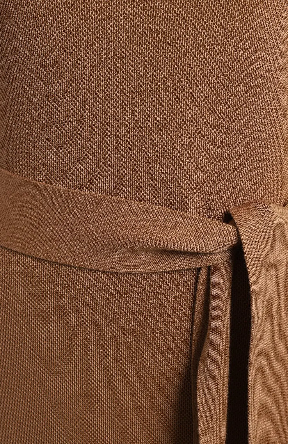 Платье Loro Piana из кашемира и шелка выполнено в теплом карамельно-коричневом оттенке и отличается лаконичным, элегантным дизайном. Модель имеет прямой силуэт с длинными рукавами и мягким поясом на талии, который подчеркивает женственность фигуры. Мелкий фактурный узор придаёт изделию изысканность, а деликатный блеск шелка делает образ утончённым. Это универсальное платье идеально подойдёт как для повседневных выходов, так и для утончённых деловых встреч.
