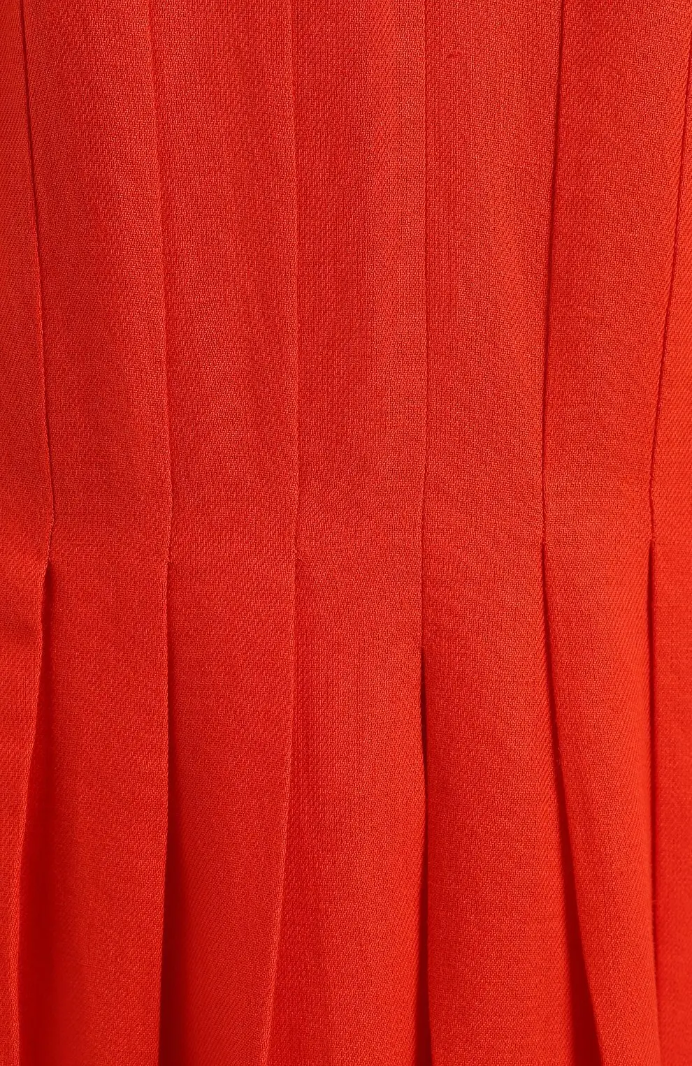 Льняное платье Loro Piana насыщенного оранжевого оттенка создано из лёгкого натурального льна, обеспечивающего комфорт и прохладу в тёплую погоду. Лаконичный V-образный вырез подчёркивает линию шеи, а мягкие складки на юбке придают изделию женственность и динамичность. Элегантный силуэт длины миди делает это платье универсальным выбором для летних прогулок, отдыха или дневных мероприятий в стиле утончённого минимализма.
