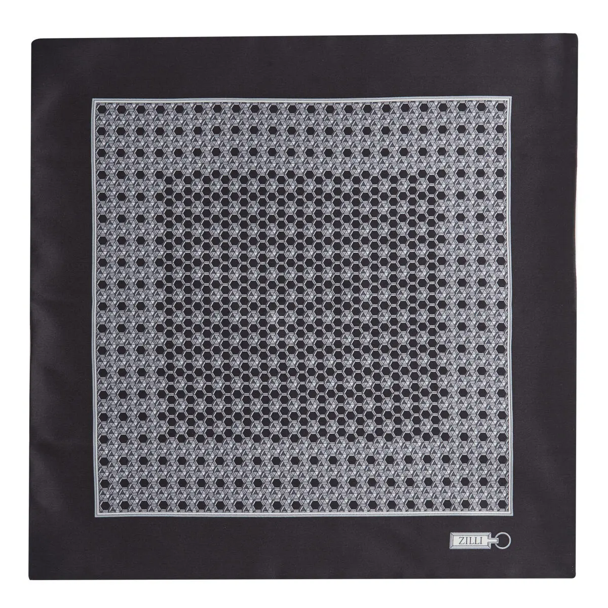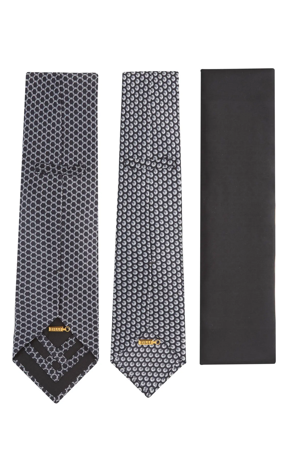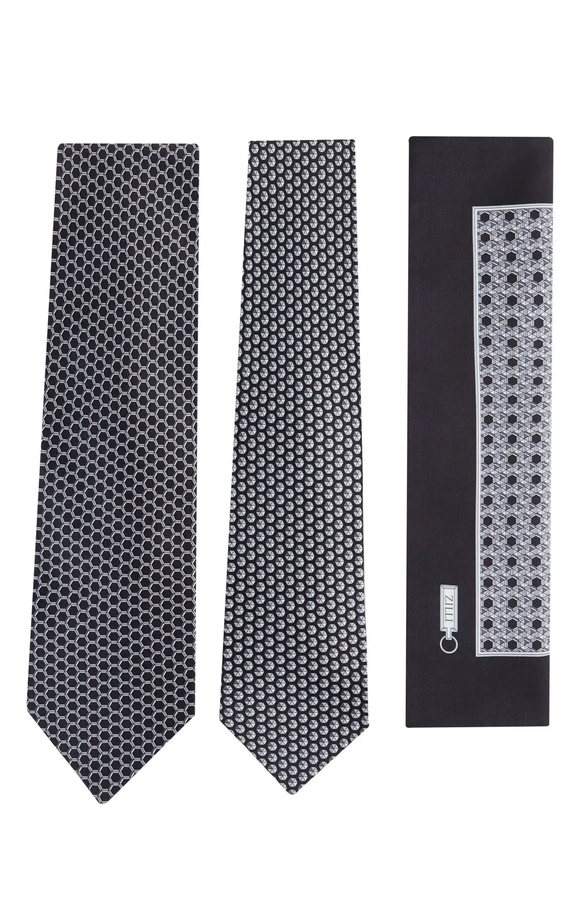 Набор Zilli из двух галстуков и нагрудного платка выполнен из гладкого шёлка с мягким сатиновым блеском. Мелкий геометрический узор в чёрно-серой гамме придаёт аксессуарам графичный, но сдержанный характер. Разные варианты принта позволяют легко комбинировать галстуки с костюмами и сорочками, а платок завершает образ, создавая аккуратный акцент в нагрудном кармане.