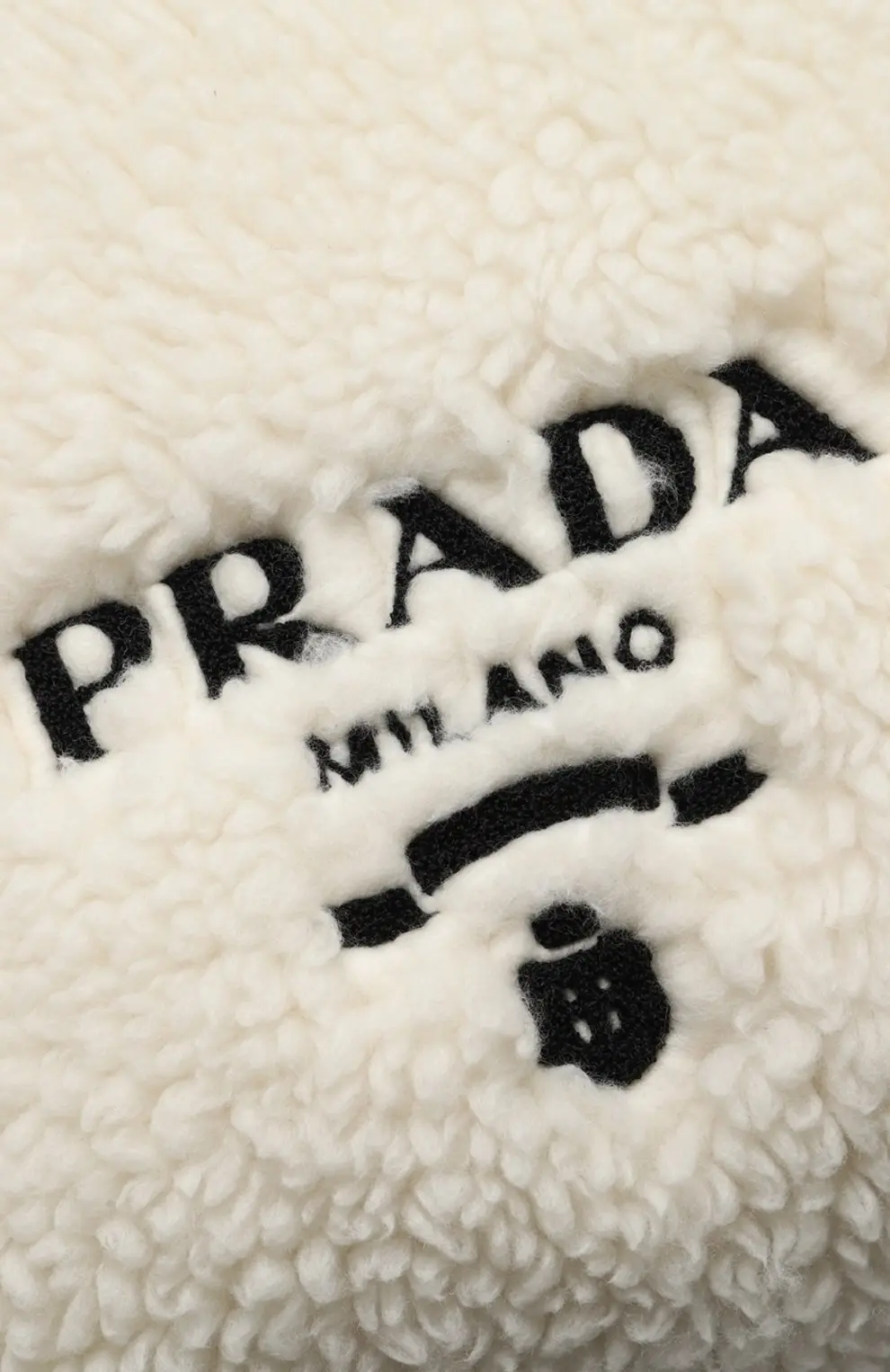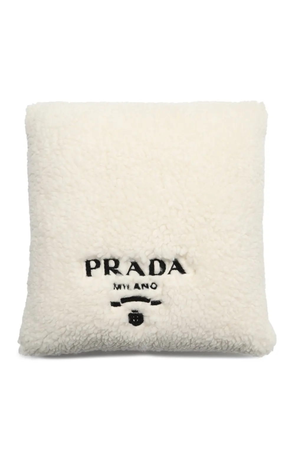 Подушка Prada выполнена из мягкого овечьего меха белого цвета, обеспечивающего уют и комфорт. Минималистичный дизайн дополнен вышитым чёрным логотипом бренда Prada Milano, что придаёт изделию утончённый акцент и отражает эстетику роскоши в повседневных деталях интерьера.