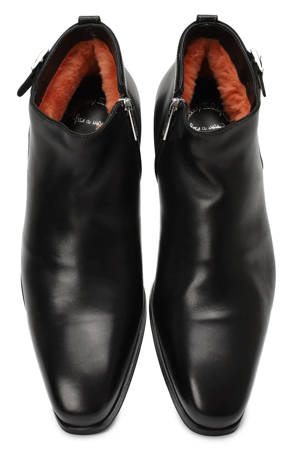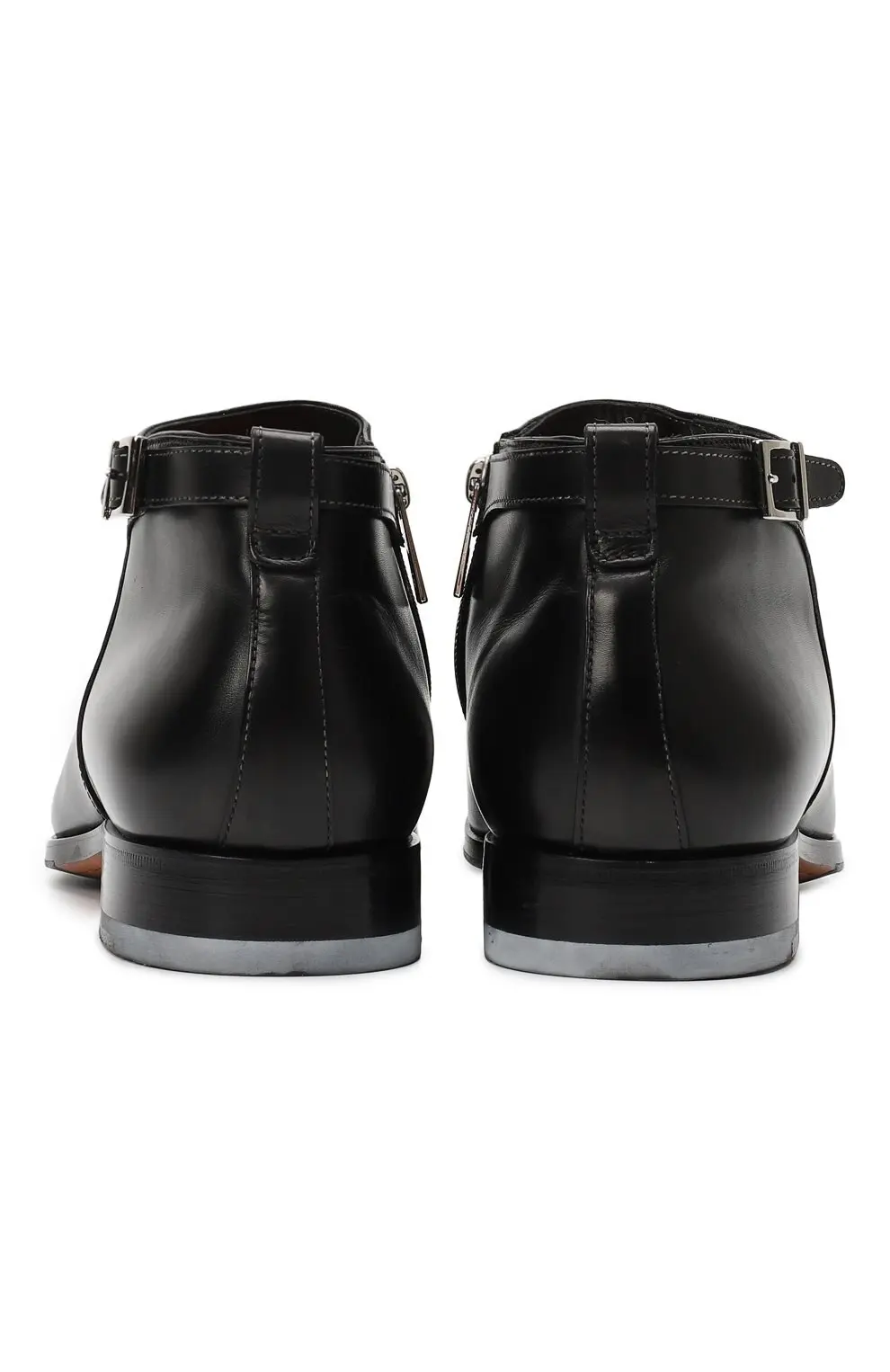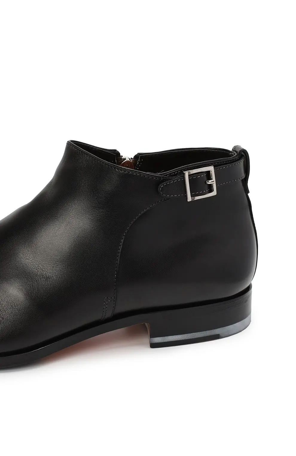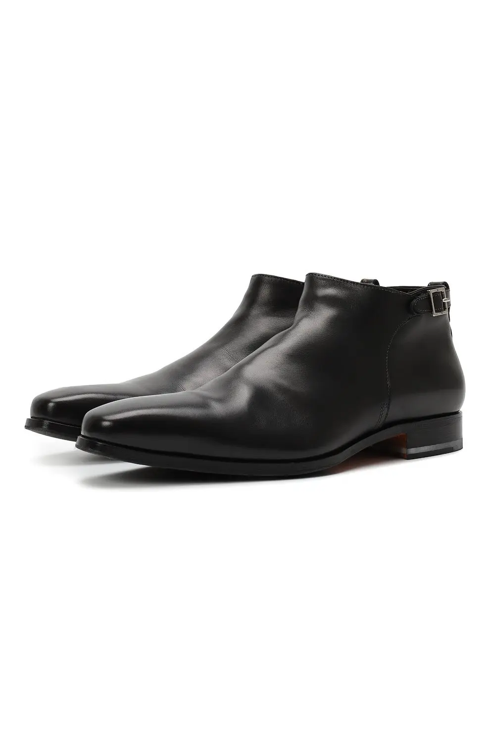 Ботинки Santoni выполнены из гладкой чёрной кожи премиального качества, отличающейся мягкостью и благородным блеском. Лаконичный дизайн подчёркивает утончённый силуэт, а небольшая пряжка сбоку добавляет изысканный акцент. Низкий каблук и прочная подошва обеспечивают комфорт при повседневной носке, сохраняя при этом элегантность. Универсальная модель идеально подойдёт как для деловых образов, так и для смарт-кэжуал стиля.