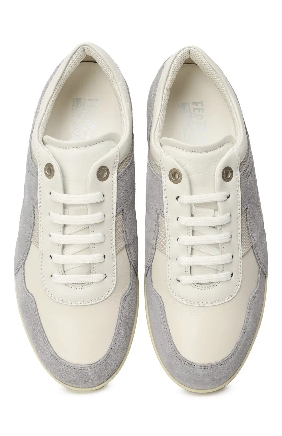 Кроссовки Salvatore Ferragamo — утончённая модель в светло-серой и кремовой гамме, выполненная из комбинации замши и гладкой кожи. Лёгкая подошва с мягким перепадом высоты обеспечивает комфорт при ходьбе, а фирменный минимализм дизайна подчёркивает элегантность бренда. Логотип Ferragamo деликатно нанесён на боковую часть, добавляя изысканный акцент.