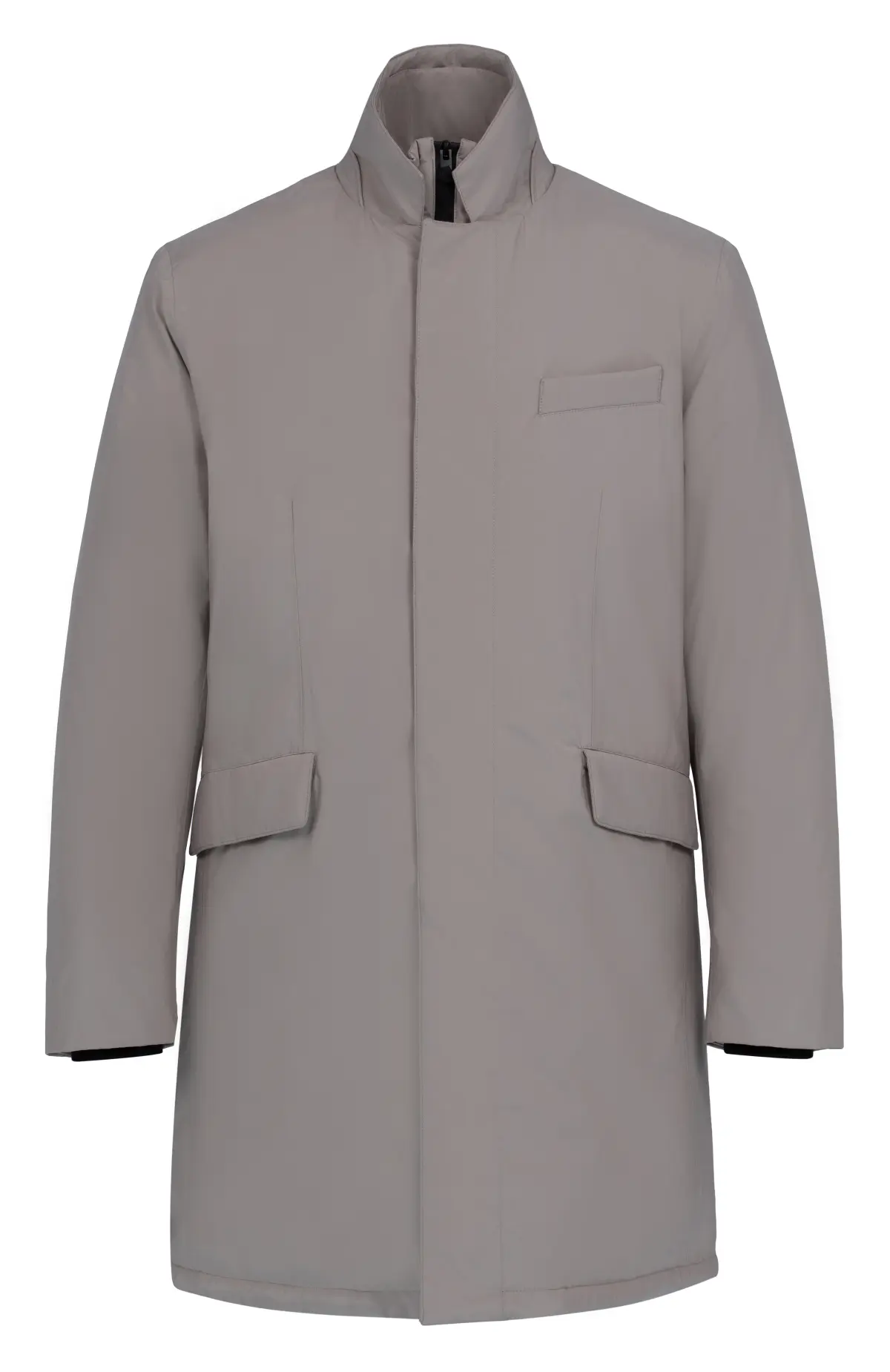 Полупальто выполнено из гладкого материала с лёгким матовым эффектом и деликатной плотностью. Прямой крой формирует сдержанный силуэт, а высокий воротник подчёркивает линию шеи и добавляет защиты от ветра. Модель дополнена скрытой застёжкой и лаконичными карманами, создавая аккуратный и современный образ.