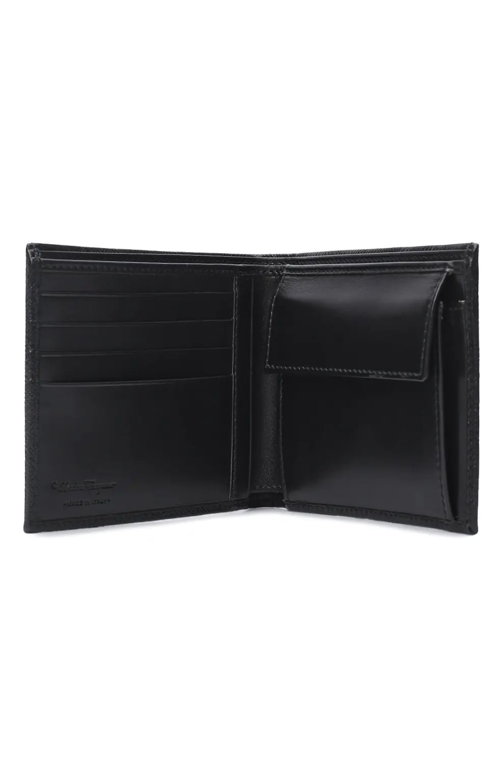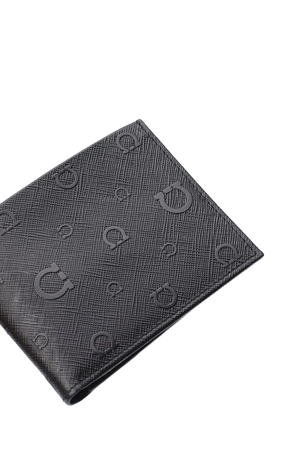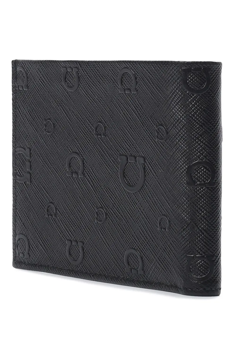 Портмоне Salvatore Ferragamo выполнено из тиснёной кожи чёрного цвета с фирменным узором Gancini. Геометрическая фактура придаёт аксессуару современный и лаконичный вид, сохраняя безупречный итальянский стиль бренда. Внутри предусмотрены отделения для купюр и карточек, что делает модель практичной и элегантной деталью мужского гардероба.
