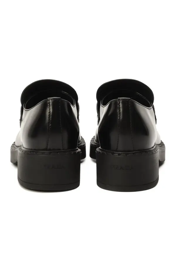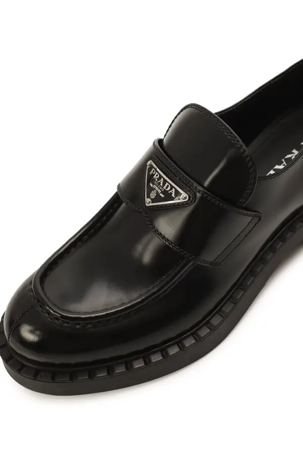 Лоферы Prada Chocolate выполнены из гладкой чёрной кожи с зеркальным блеском, придающим модели выразительный характер. Дизайн с массивной подошвой и закруглённым мыском дополнен фирменным металлическим треугольным логотипом на перемычке. Контраст сочетания лаконичных линий и мощного силуэта создаёт современное прочтение классики.