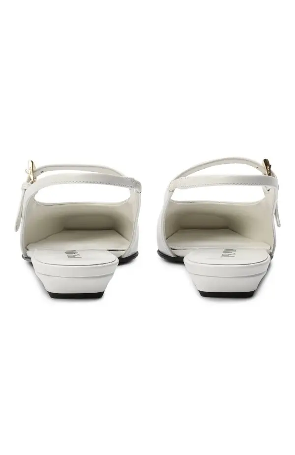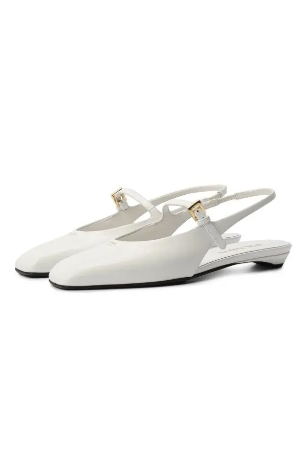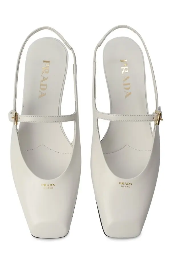 Балетки Prada из гладкой белой кожи. Модель с заострённым мыском и регулируемым ремешком на золотую пряжку. Низкий каблук и лаконичный дизайн делают обувь элегантной и универсальной для повседневных и более нарядных образов.