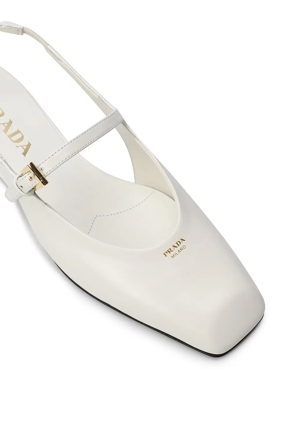Балетки Prada из гладкой белой кожи. Модель с заострённым мыском и регулируемым ремешком на золотую пряжку. Низкий каблук и лаконичный дизайн делают обувь элегантной и универсальной для повседневных и более нарядных образов.