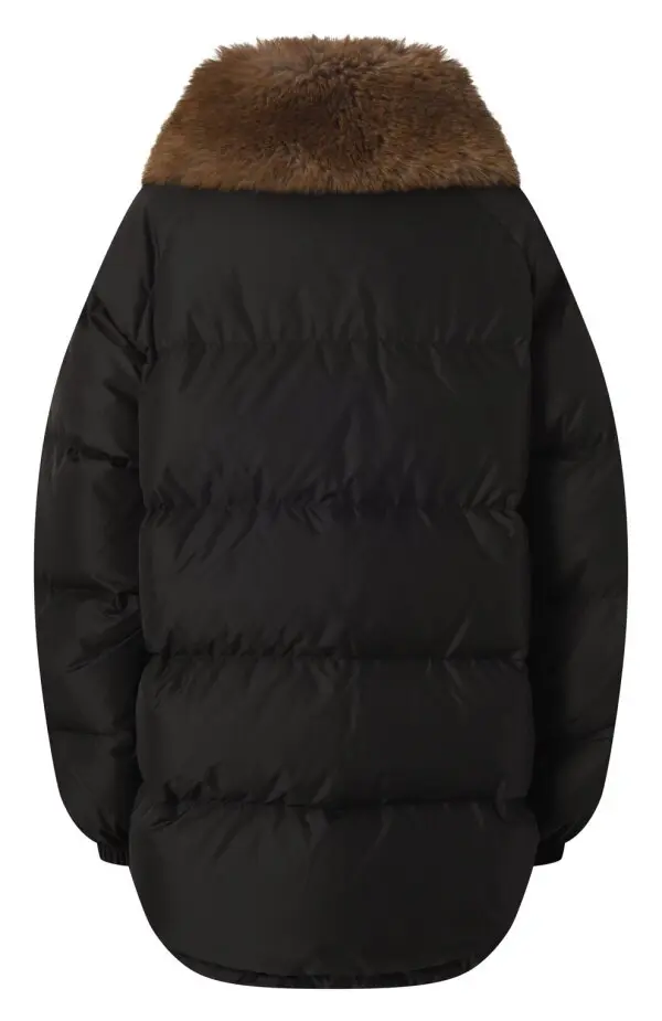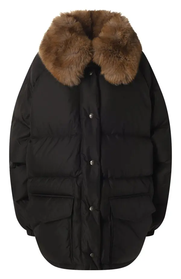 Пуховик Prada чёрного цвета выполнен из прочного полиамида с мягким блеском и утеплён натуральным пухом. Объёмный крой подчёркнут роскошным коричневым меховым воротником, создающим эффектный контраст. Застёжка на кнопки и вместительные карманы делают модель практичной и стильной — воплощение современного взгляда бренда на зимнюю классику.