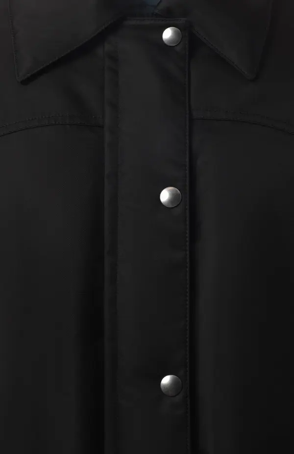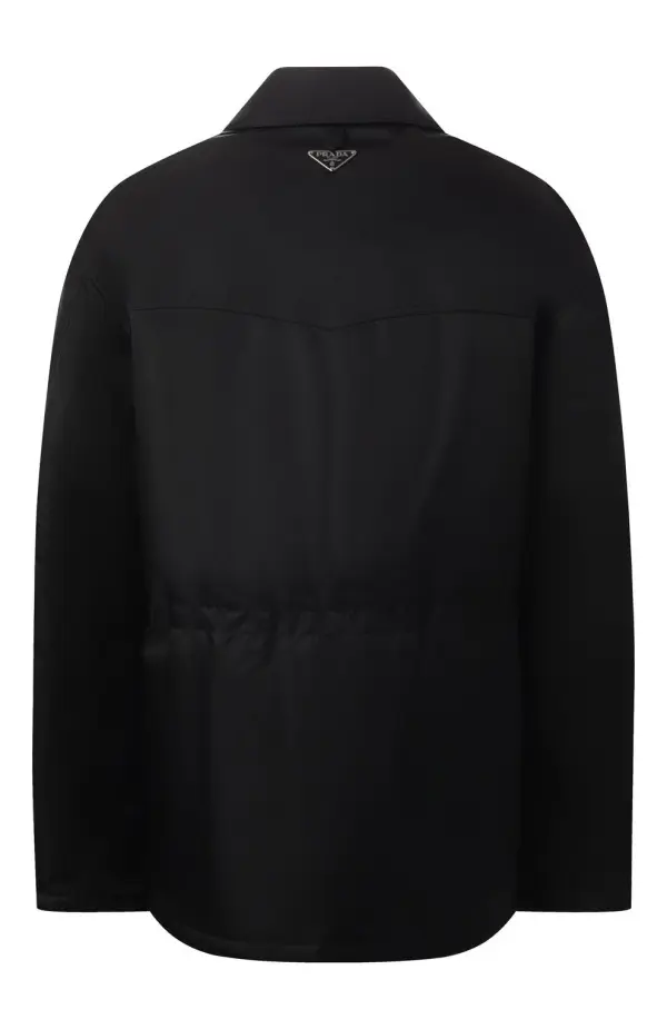 Женский пуховик Prada из гладкого нейлона с матовой поверхностью и лёгким блеском. Модель с прямым силуэтом, утеплённая натуральным пухом, дополнена отложным воротником и крупными накладными карманами с клапанами. Лаконичный дизайн отражает характерную минималистичную эстетику бренда.
