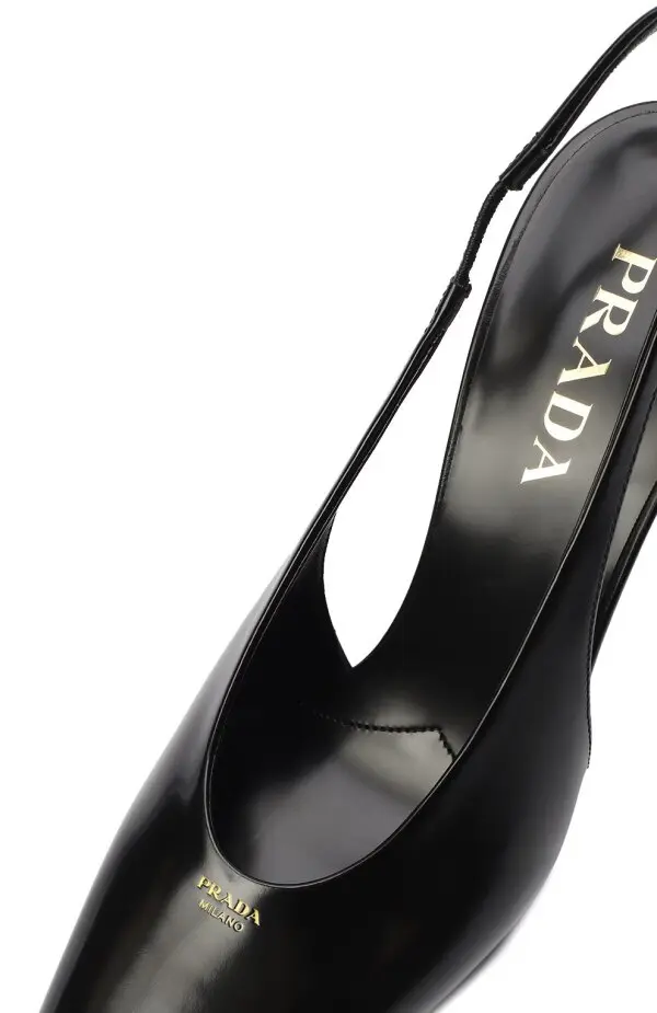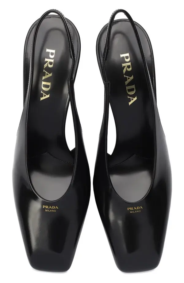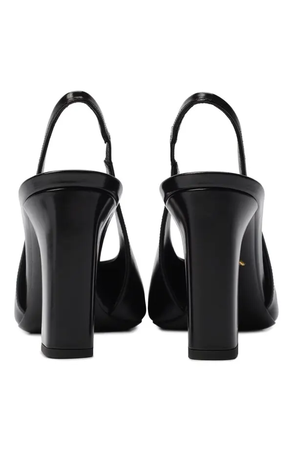 Туфли Prada чёрного цвета выполнены из гладкой полированной кожи. Модель с открытой пяткой и ремешком на резинке отличается лаконичным дизайном и квадратным мысом. Устойчивая геометричная танкетка придаёт силуэту современное звучание, сохраняя элегантность классики.