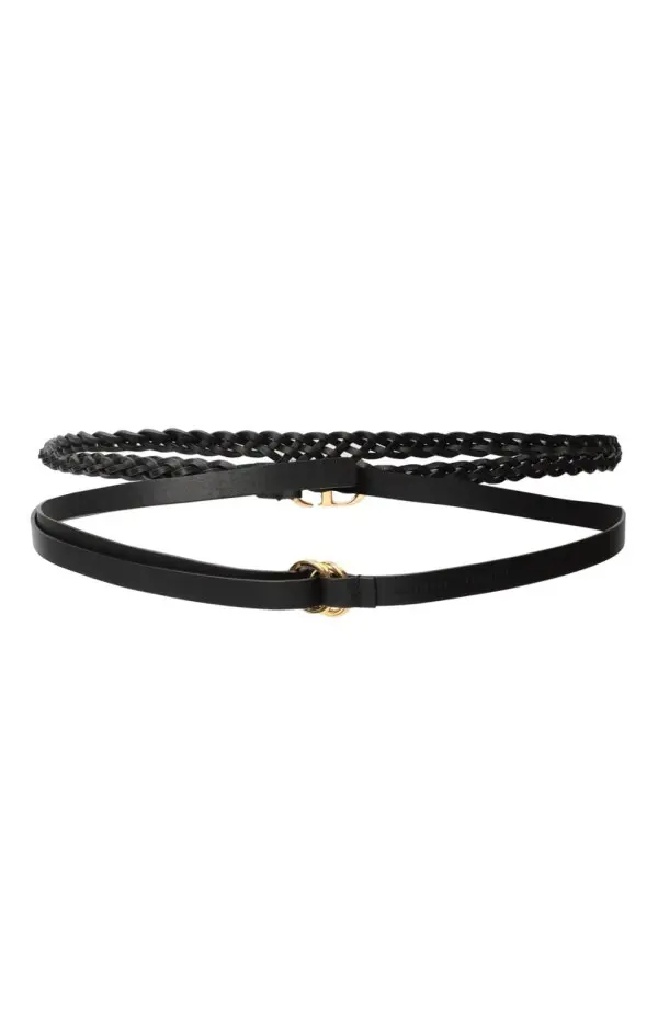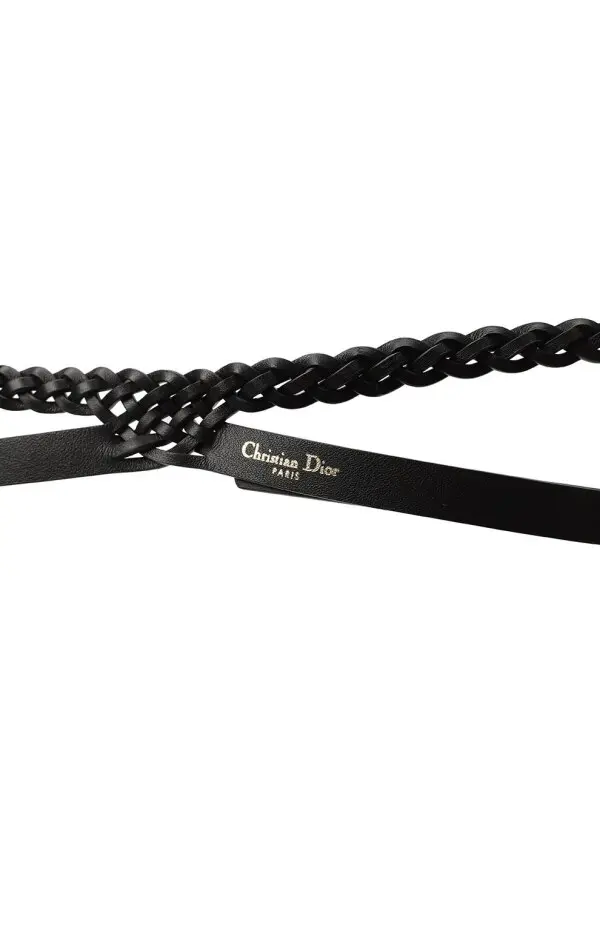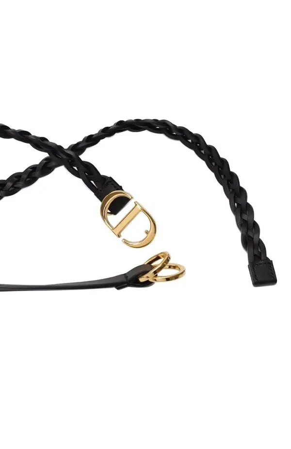 Этот элегантный ремень от Dior выполнен из гладкой черной кожи и дополнен плетёным элементом, что придаёт ему интересную фактурность и современный характер. Центральным акцентом служит изящная пряжка с культовой монограммой CD в золотистом оттенке, которая гармонично контрастирует с глубиной черного цвета. Изделие сочетает в себе минимализм и утончённые детали, позволяя легко адаптировать его как для повседневных, так и для вечерних нарядов. Такой ремень не только фиксирует силуэт, но и становится знаковым аксессуаром, подчеркивающим стиль и вкус его обладательницы.