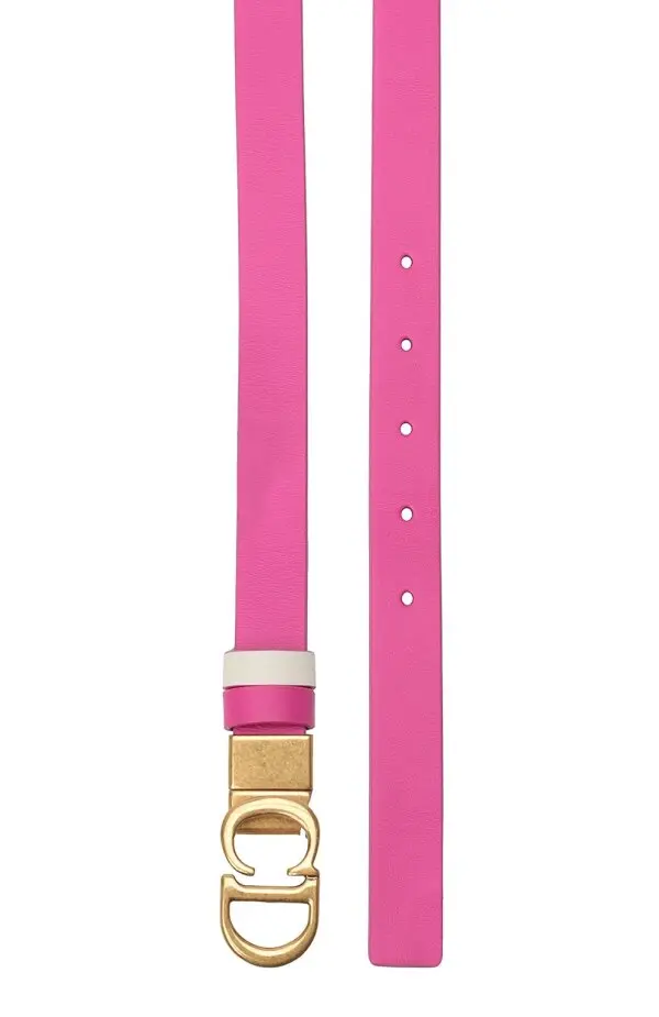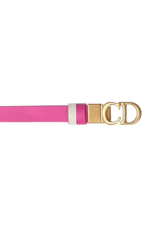 Двусторонний ремень Dior выполнен из гладкой кожи и украшен фирменной пряжкой CD в матовом золотистом оттенке. Сочетание ярко-розовой и кремовой сторон позволяет варьировать стиль — от выразительного акцента до элегантной нейтральности. Изысканный аксессуар, который подчеркнёт талию и добавит утончённости любому образу.