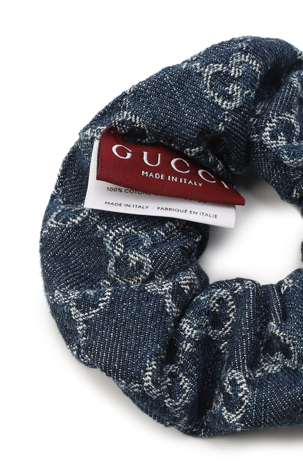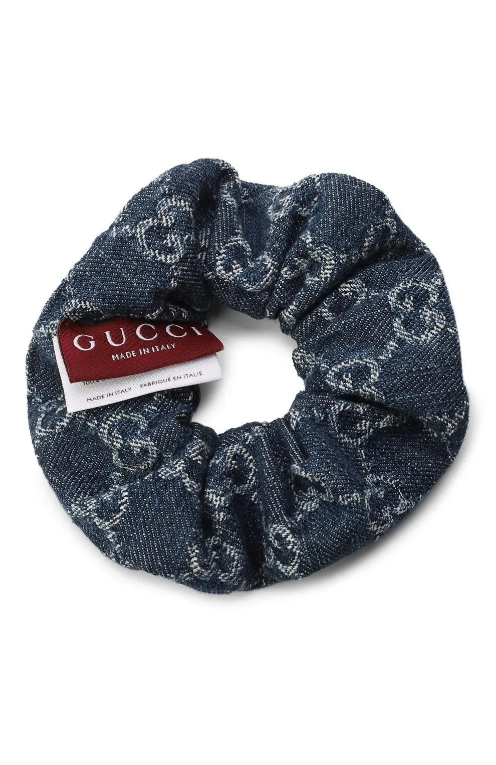 Резинка для волос Gucci из джинсовой ткани с фирменным монограммным узором GG. Практичный и стильный аксессуар, который легко дополнит как повседневные, так и модные образы. Изготовлена в Италии, сочетает комфорт и узнаваемый дизайн бренда.