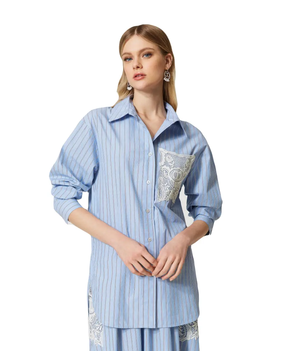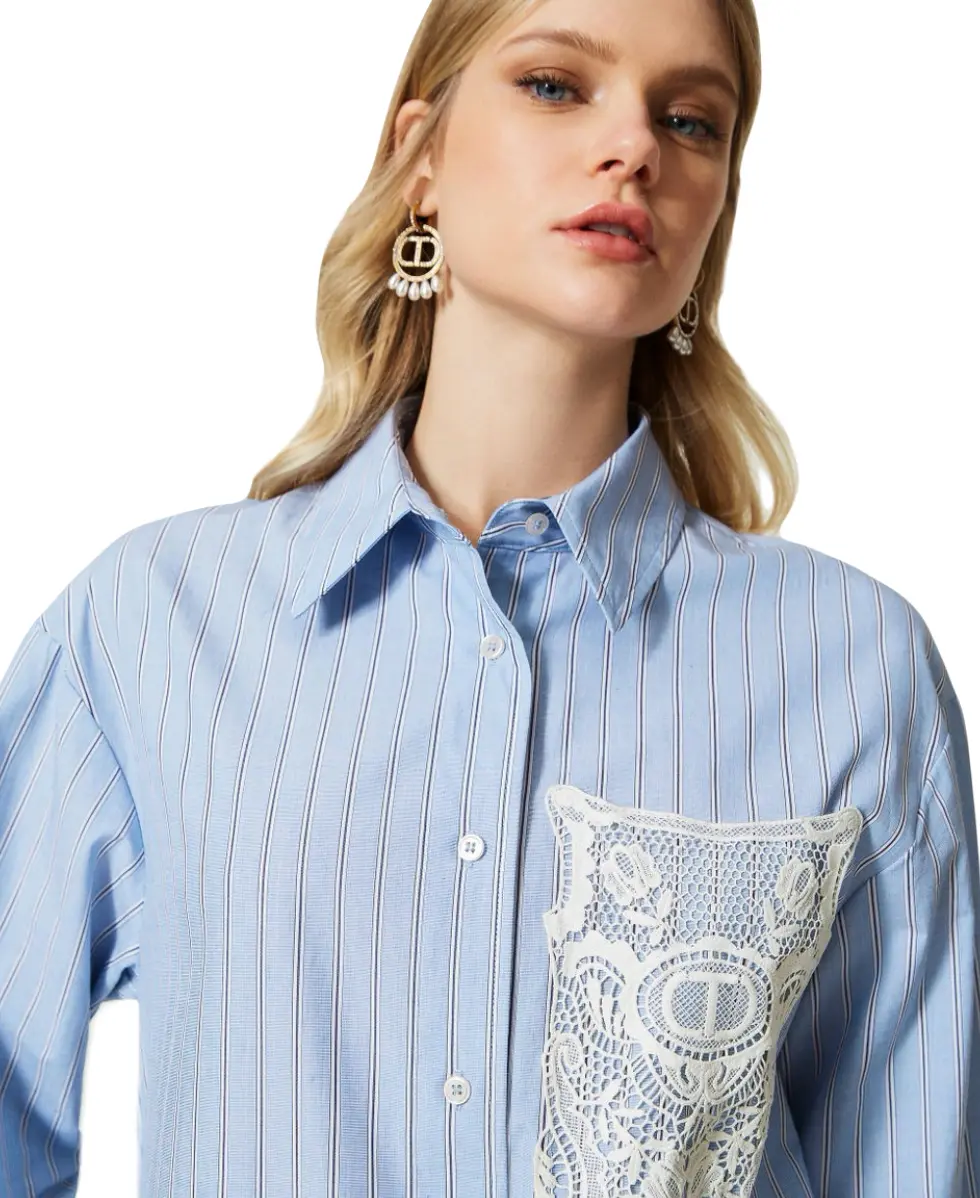 Эта длинная рубашка TWINSET станет изюминкой вашего образа. Рубашка выполнена из окрашенного в пряже хлопкового поплина. Изделие украшено тонким полосатым узором и нагрудным карманом с аппликацией логотипа в стиле макраме. Модель имеет широкий крой, застежку на пуговицы, рукава с манжетами и разрезы по бокам. Носите рубашку с брюками, чтобы создать эффектный костюмный образ.