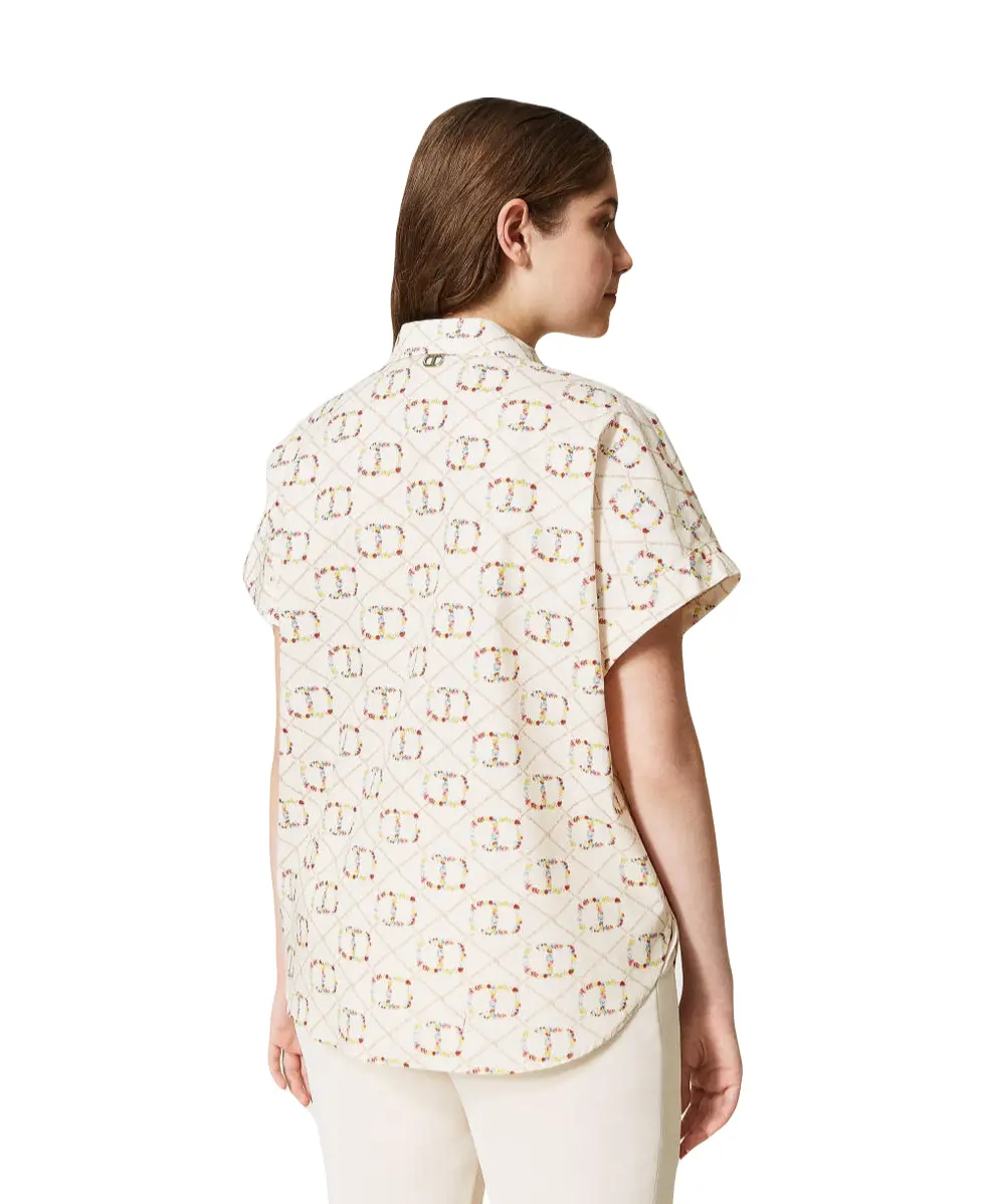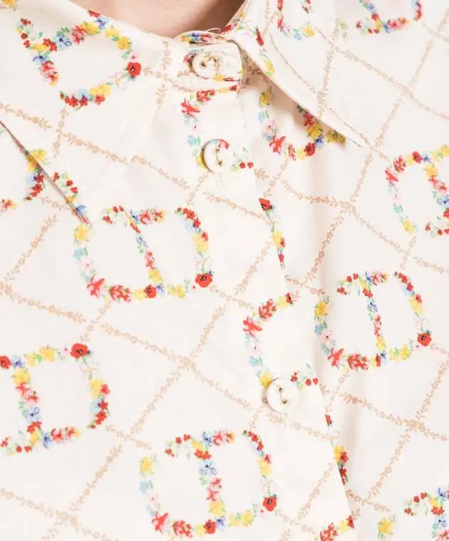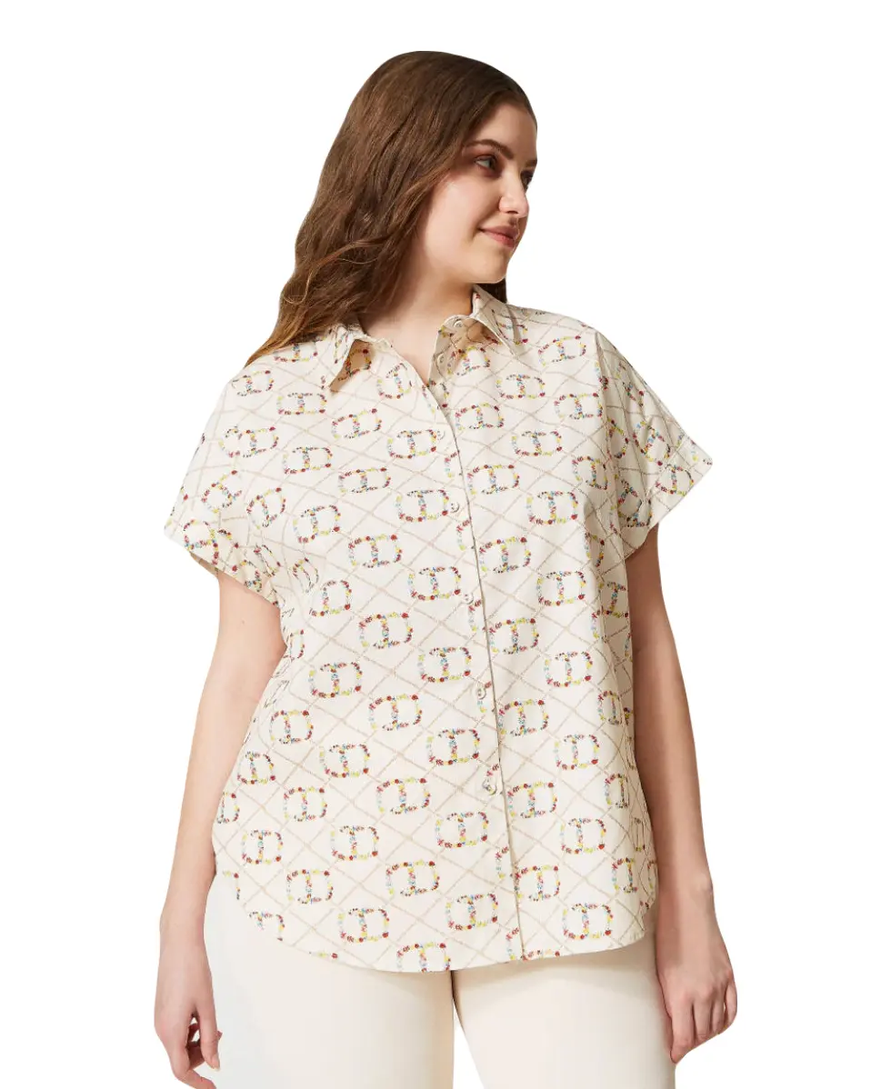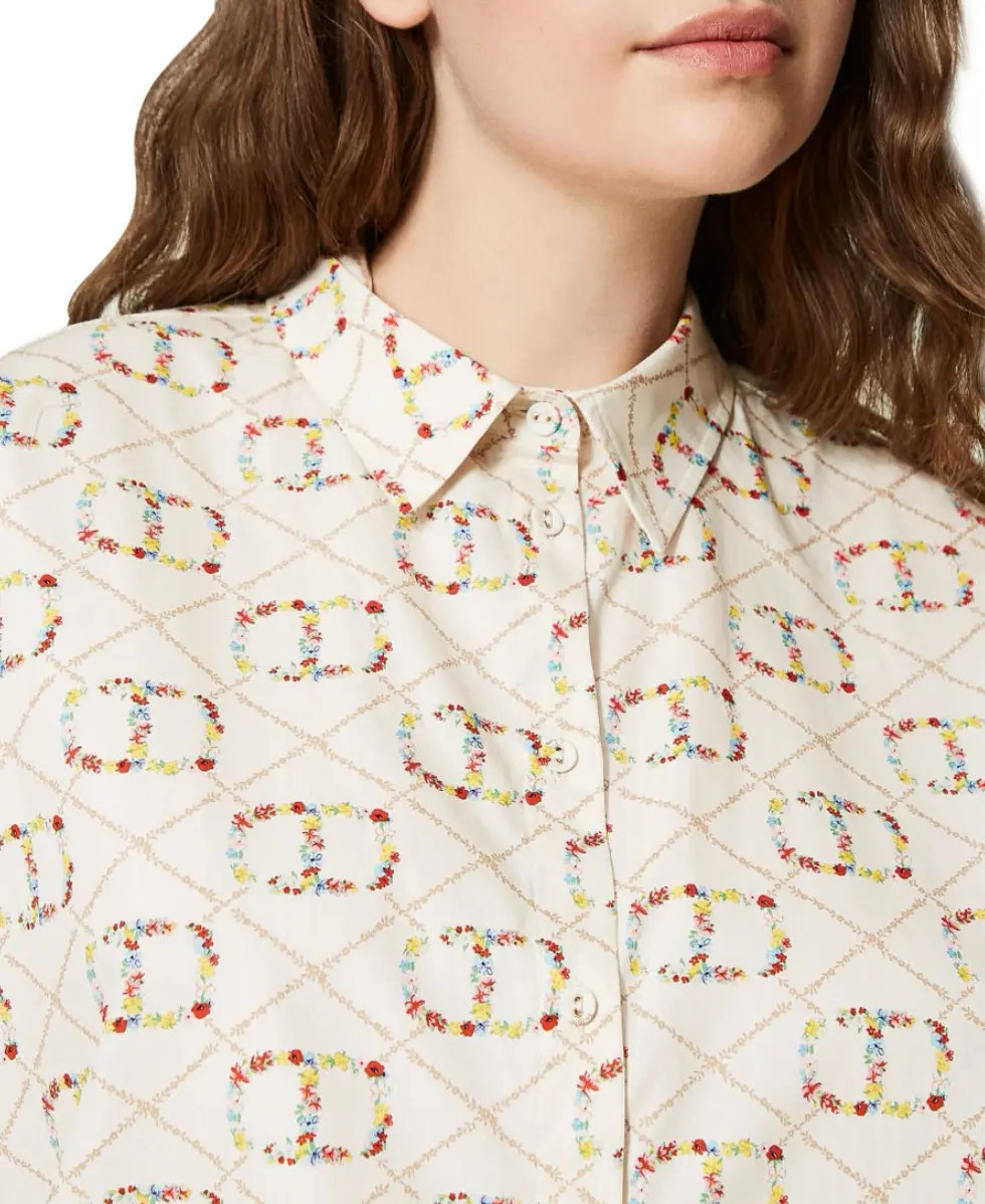 Рубашка TWINSET из хлопкового поплина. Дополните свой сезонный гардероб этой фирменной рубашкой из с цветочным принтом и разноцветным логотипом Oval T по всей поверхности. Изделие имеет прямой фасон, короткие рукава, округлый низ и застежку на обтяжные пуговицы. Создайте с этой рубашкой образы с графическим штрихом, сочетая ее с брюками со стрелками TWINSET.