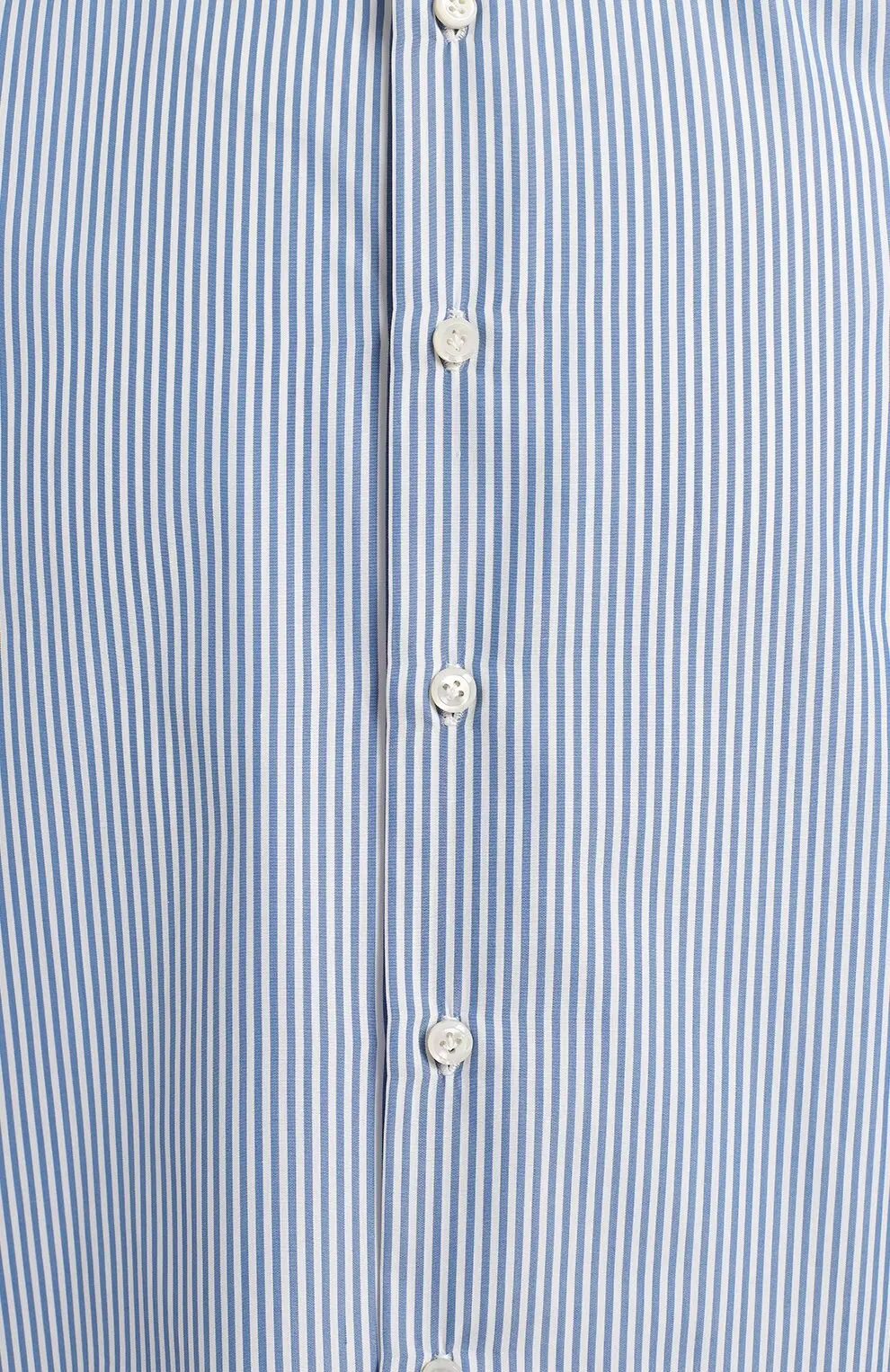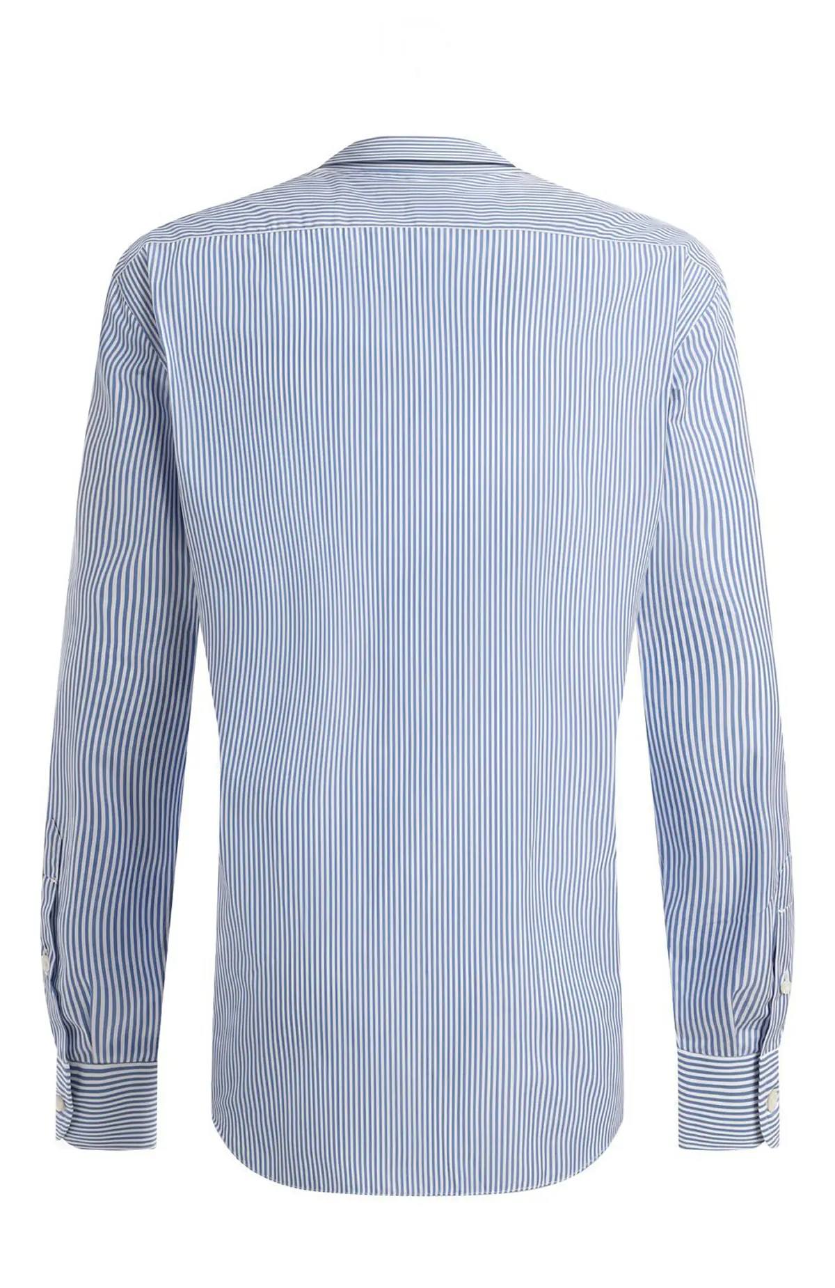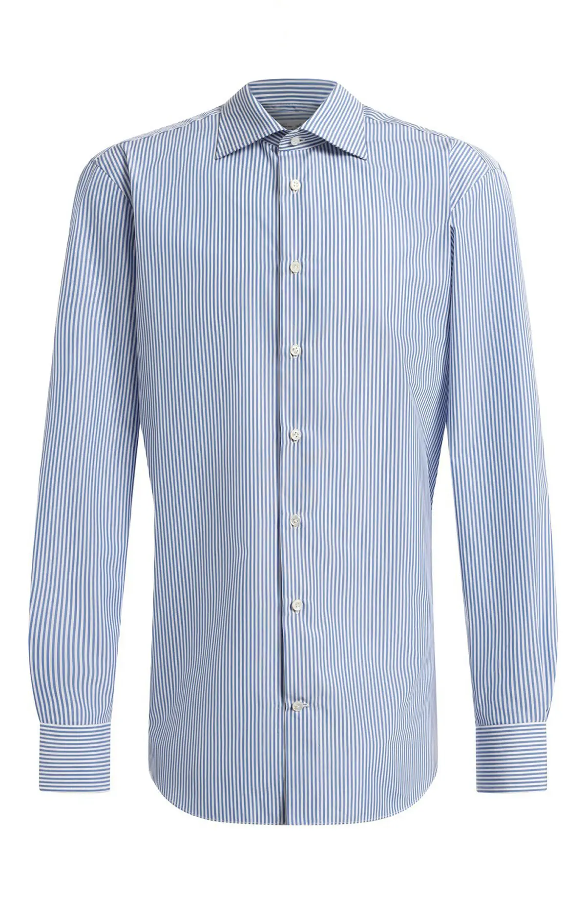 Хлопковая рубашка Cesare Attolini выполнена из лёгкого поплина в тонкую синюю полоску. Классический крой с аккуратным воротником подчёркивает элегантность и универсальность модели. Подходит для офиса и формальных мероприятий, сохраняя комфорт в течение дня.