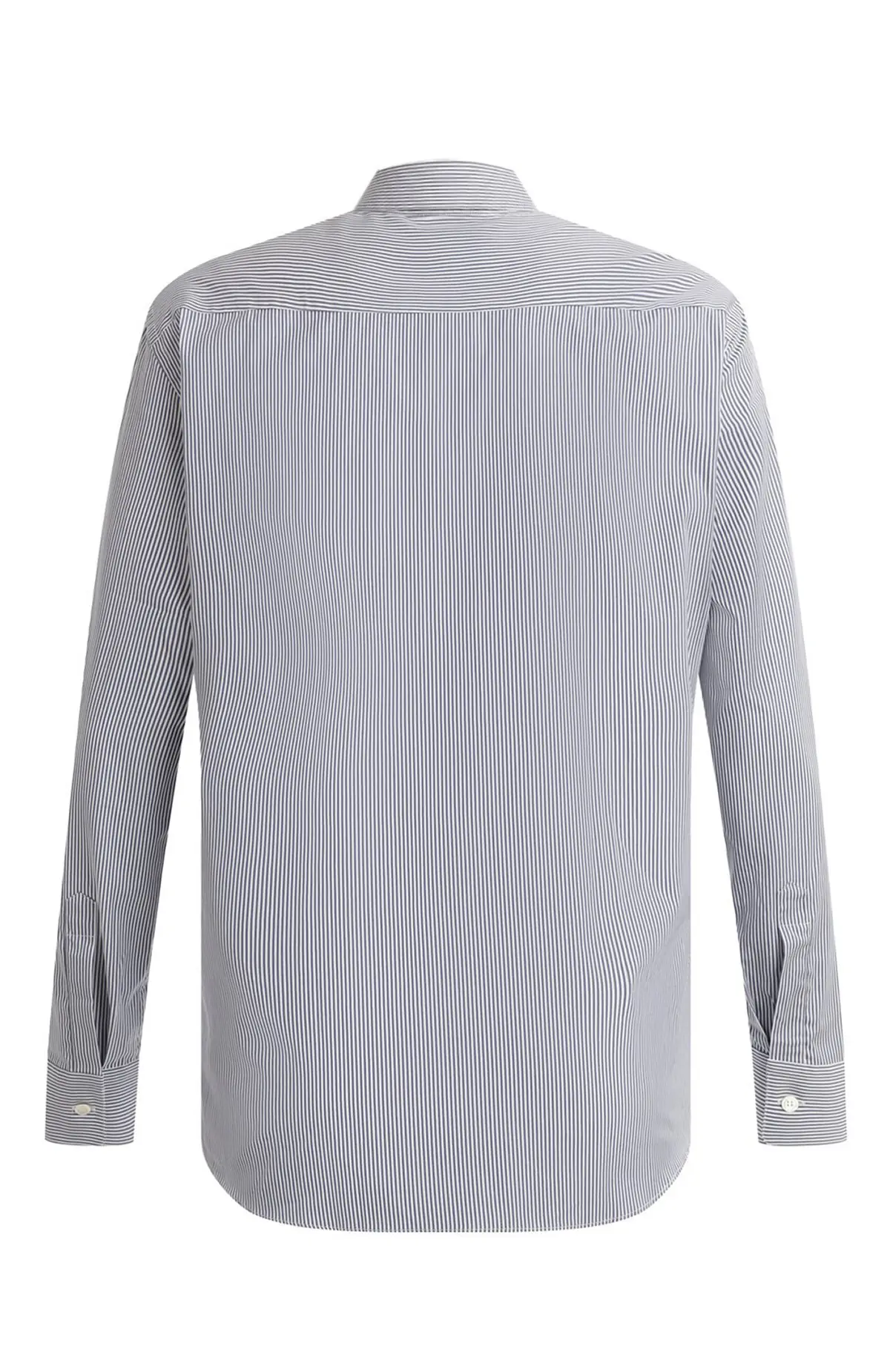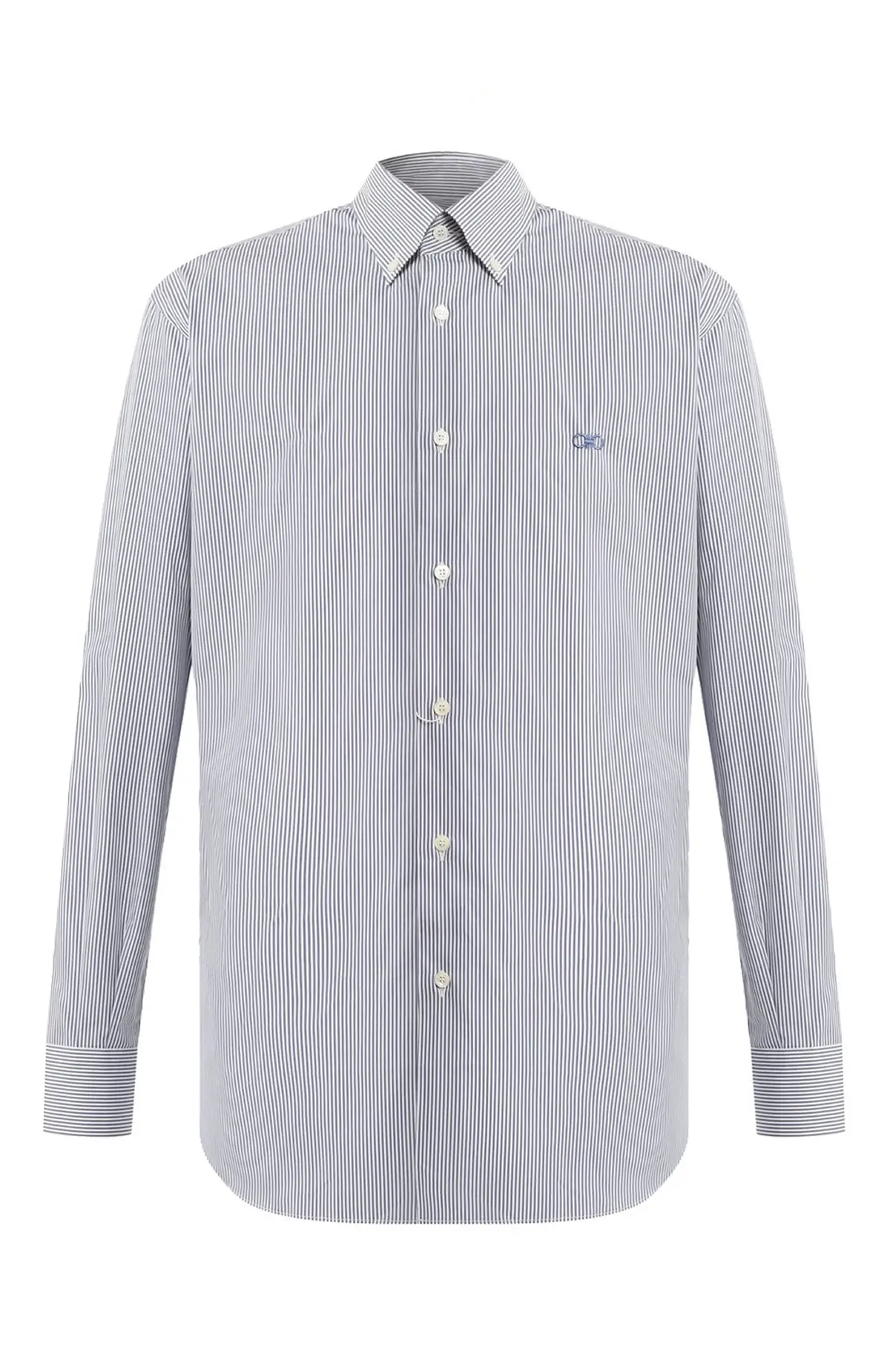 Хлопковая рубашка Salvatore Ferragamo выполнена из тонкого хлопка с деликатным синим принтом в узкую полоску. Классический крой с отложным воротником и манжетами на пуговицах подчёркивает элегантность итальянского стиля. Небольшая вышивка с логотипом бренда на груди добавляет изделию утончённый акцент. Универсальная модель подходит как для делового, так и для повседневного образа.