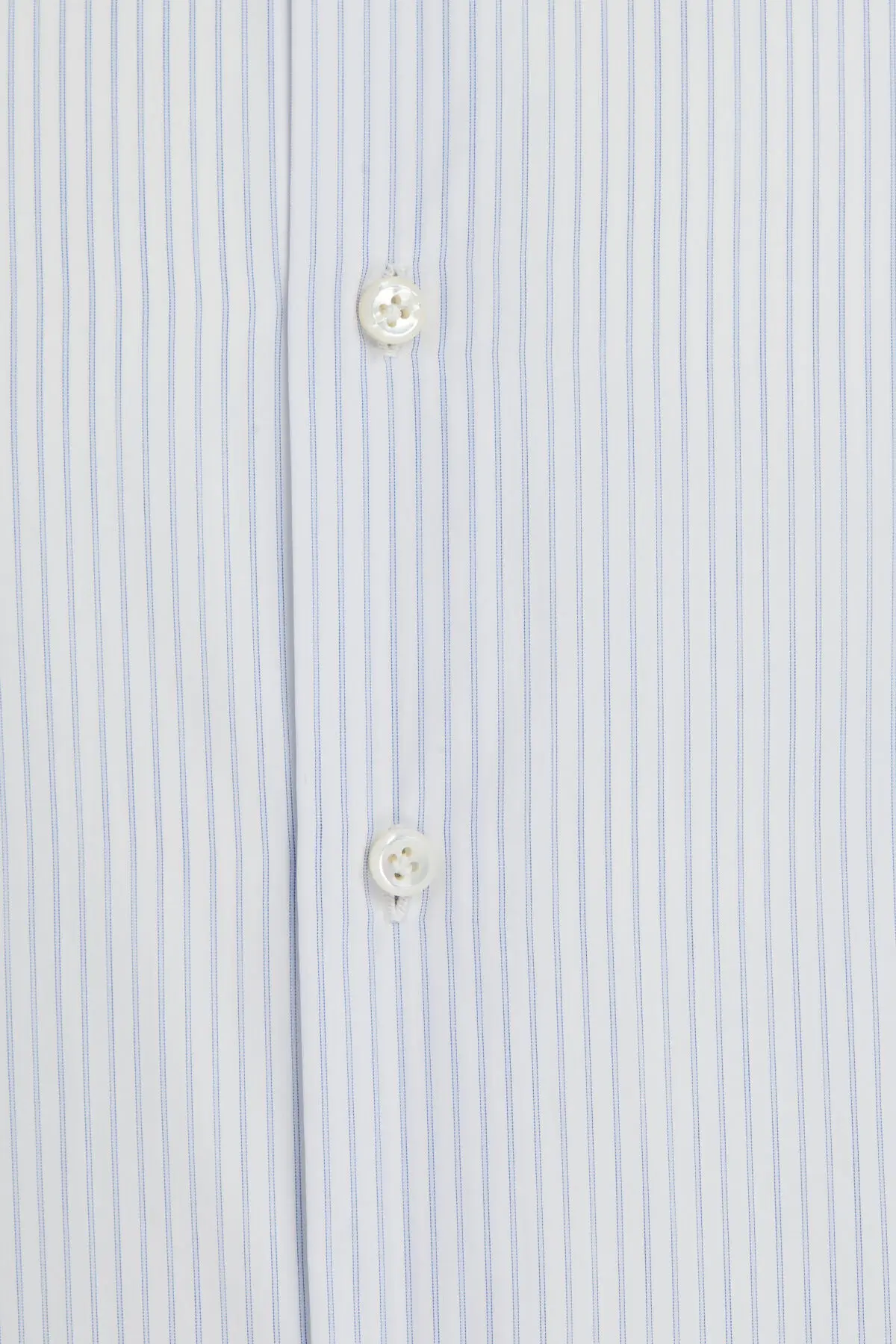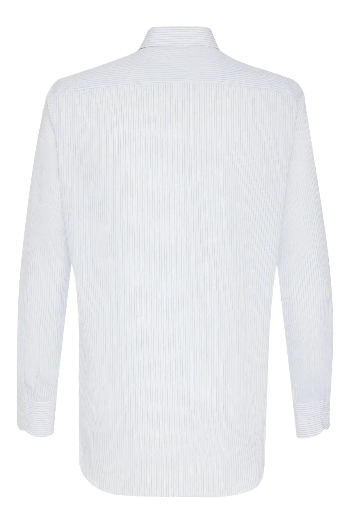 Рубашка с длинными рукавами выполнена из тонкого хлопка в светло-голубую вертикальную полоску. Классический воротник и застежка на пуговицы подчеркивают лаконичный силуэт и безупречный крой модели. Нейтральная расцветка легко сочетается с деловыми костюмами и повседневными брюками, делая рубашку универсальной основой гардероба.