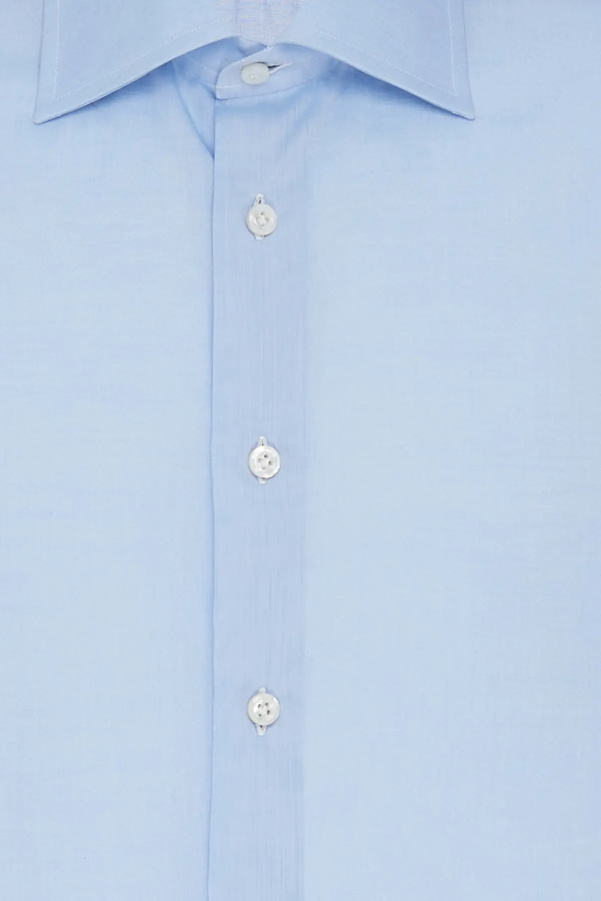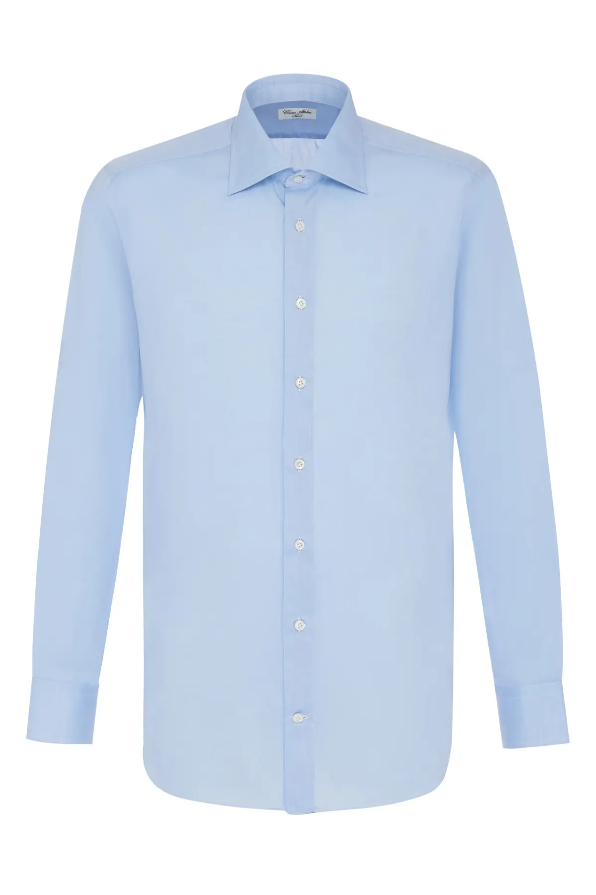 Однотонная светло-голубая рубашка выполнена из гладкого тонкого хлопка и оформлена классическим отложным воротником. Прямой силуэт с длинными рукавами и застёжкой на пуговицы обеспечивает универсальную посадку и комфорт в течение дня. Базовая модель легко сочетается с деловыми костюмами и неформальными жакетами.